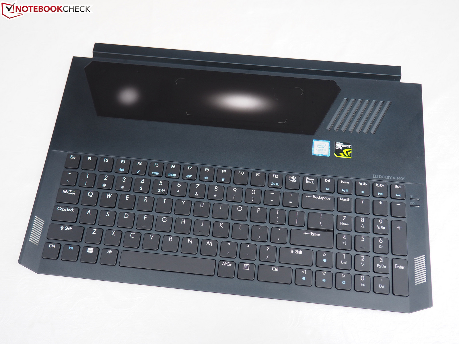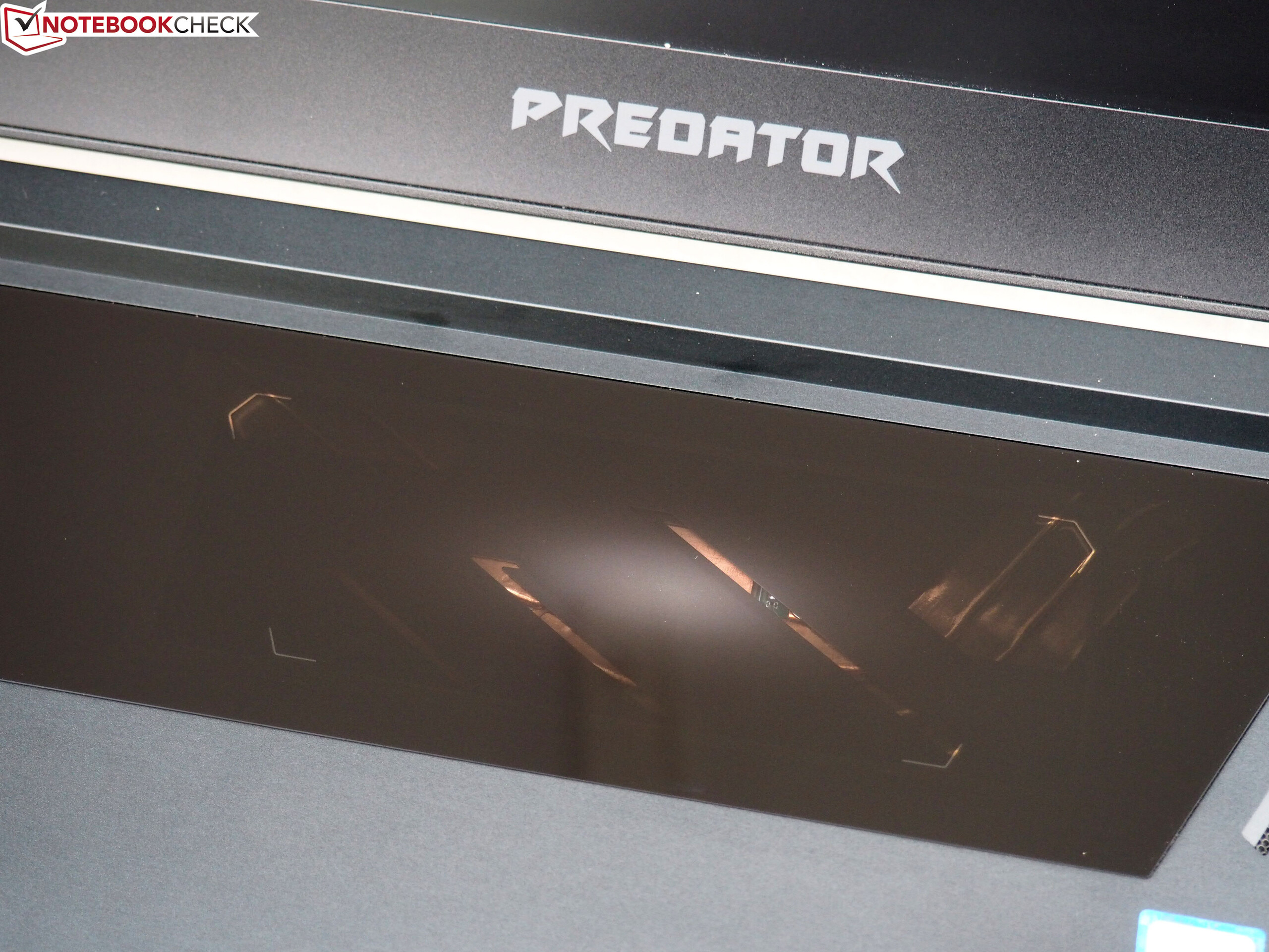 Als auffällig entpuppt sich indes das Areal über der (natürlich beleuchteten) Anti-Ghosting-Tastatur. Hier verbaut Acer eine große Glanzfläche, die das Touchpad beherbergt, einen Blick auf den linken Lüfter gewährt und aus Gorilla-Glas besteht. Am rechten Rand findet sich hingegen ein Gitter für den zweiten Lüfter. Dass Acer bei der Glasfläche kein symmetrisches Design gewählt hat, ist auf die Kühlung zurückzuführen.
