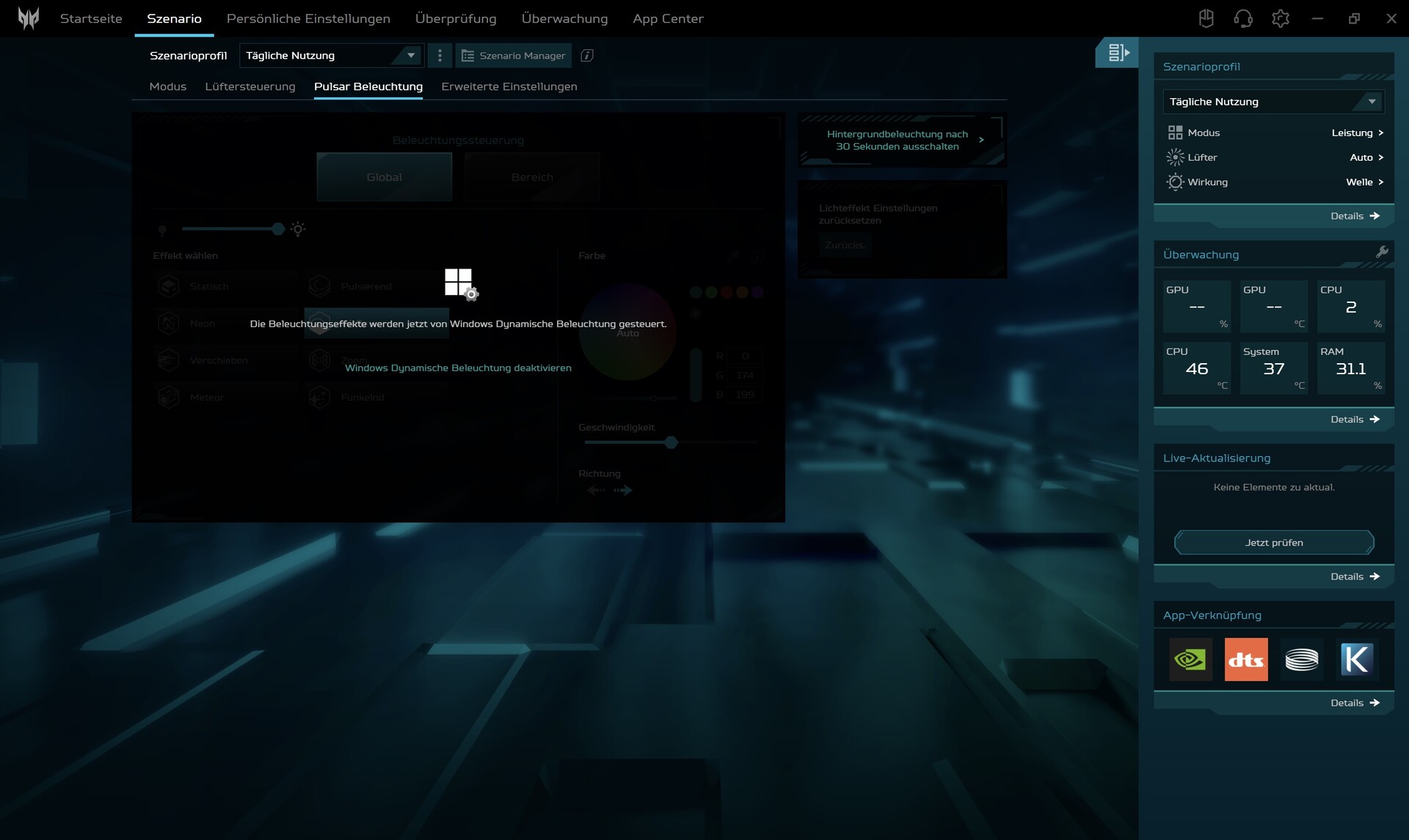 Bei den Temperaturen tanzt der Acer-Spross nicht aus der Reihe. Maximal 46 °C auf der Ober- und maximal 48 °C auf der Unterseite sind typisch für ein RTX 4070-Gerät. Im Idle-Betrieb verweilt das Chassis unter der 30-°C-Marke, bleibt also angenehm kühl.