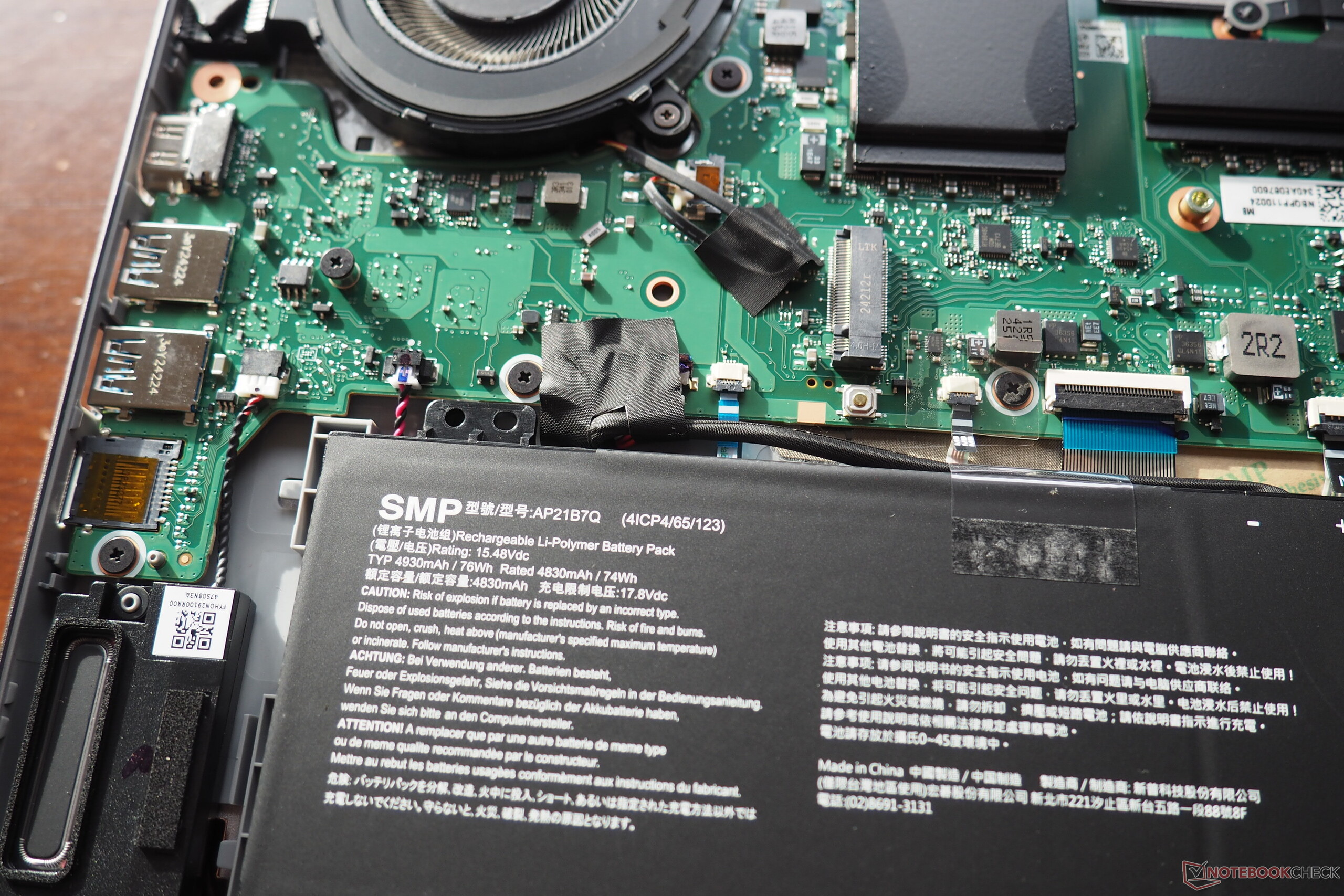 Die ziemlich fest sitzende Bodenplatte ist mit 11 Torx-Schrauben gesichert. Im Inneren zeigt sich ein recht aufgeräumtes bzw. überschaubares Bild. Neben dem Funkmodul können nur die SSD und der Akku entnommen werden. Das Kühlsystem (laut Acer kommt Liquid Metal zum Einsatz) besteht aus zwei Lüftern und mehreren Heatpipes.