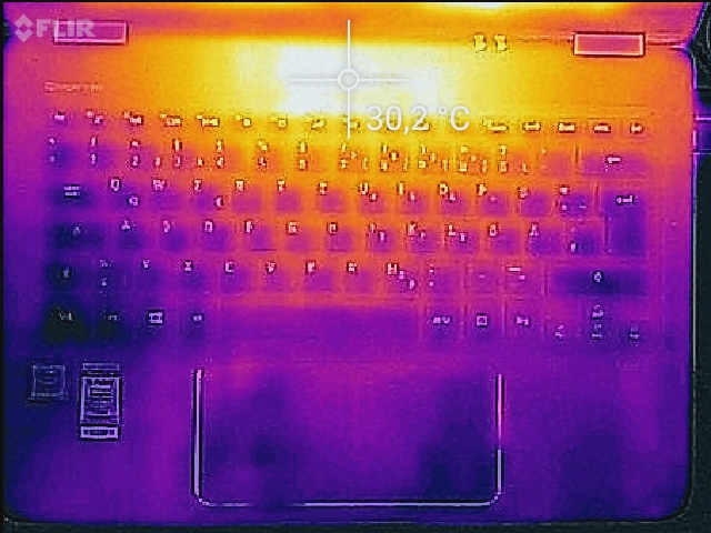 (+) Die Handballen und der Touchpad-Bereich sind mit gemessenen 27.6 °C kühler als die typische Hauttemperatur und fühlen sich dadurch kühl an.