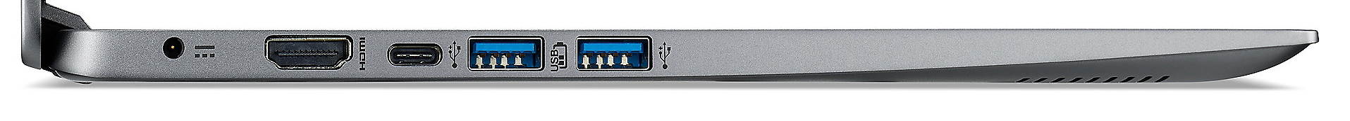 Obwohl das Swift 1 kompaktere Maße aufweist als der Vorgänger, spendiert Acer dem neuen Modell mehr Schnittstellen. Drei der vier USB-Steckplätze (2x Typ A, 1x Typ C) arbeiten nach dem USB-3.1-Gen-1-Standard. Bei dem vierten Steckplatz handelt es sich um ein USB-2.0-Modell (Typ A). Ein externer Monitor könnte per HDMI angeschlossen werden. Die Anordnung der Anschlüsse gefällt: Diese befinden sich in den hinteren Bereichen beider Seiten. Somit bleibt der Platz neben der Handballenablage frei von Kabeln.