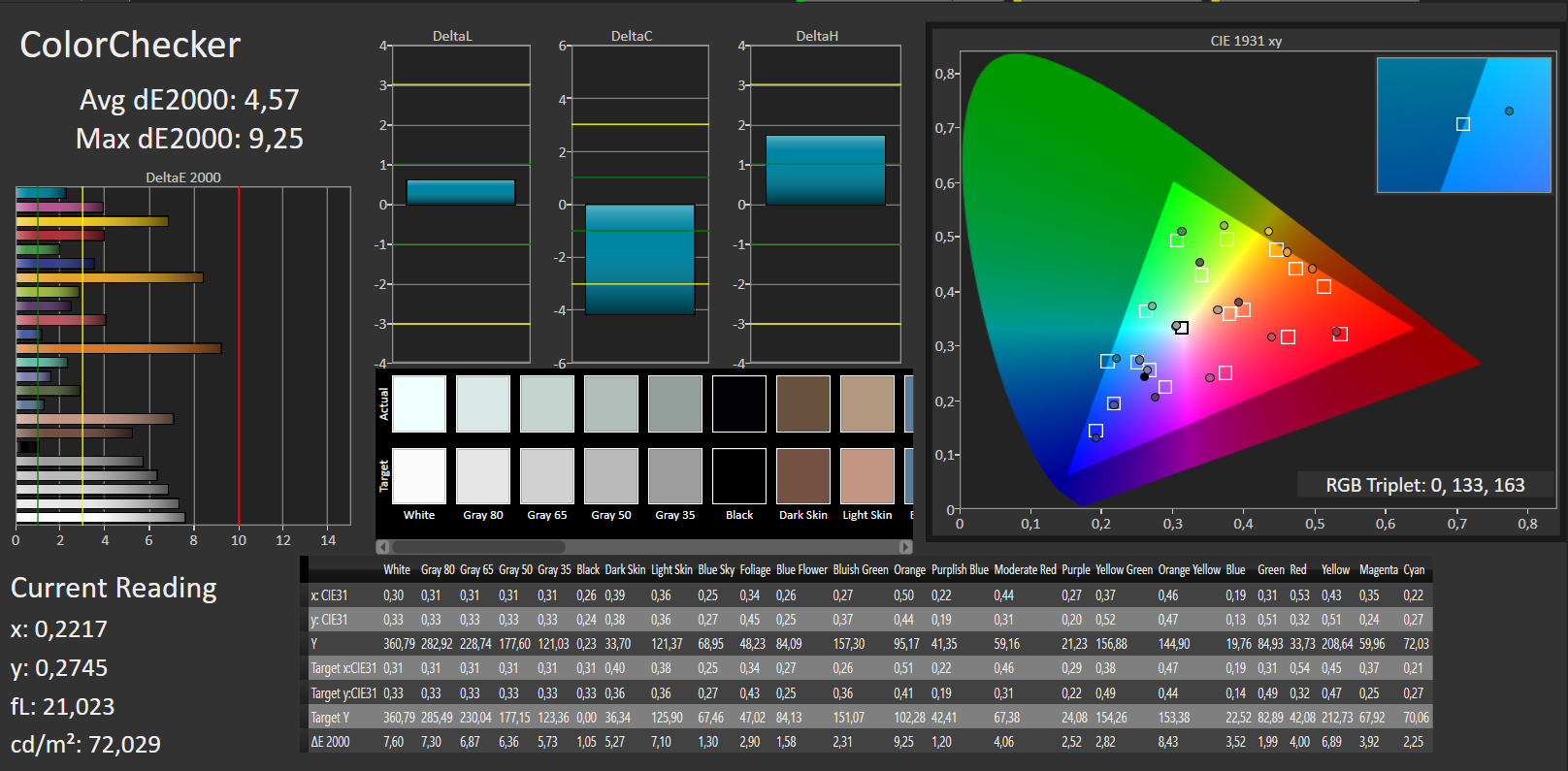 ΔE ColorChecker Calman: 4.57 | ∀{0.5-29.43 Ø4.78}
