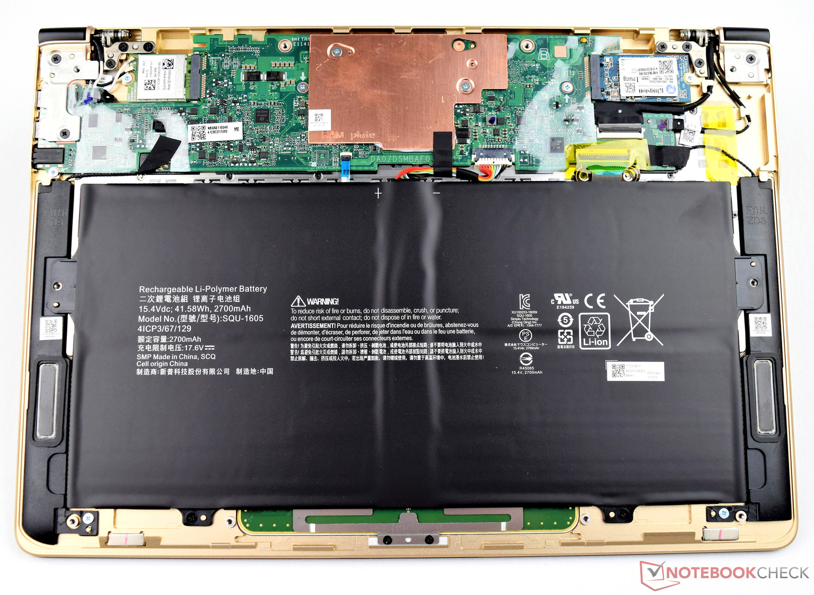 Die Wartungsmöglichkeiten halten sich bei einem lüfterlosen Gerät in Grenzen. Die Reinigung des Lüfters entfällt und es bleibt nur die Option "Upgrade". Die Bodenplatte kann bei dem Acer Swift 7 ohne spezielles Werkzeug problemlos entfernt werden. Im Inneren überwiegt der Akku, welcher ca. drei Viertel des Innenraumes für sich beansprucht. Im oberen Bereich befindet sich die Hauptplatine, mit CPU und RAM, welche sich unter der Kupferplatte befinden. Tauschbar wäre das WLAN-Modul, sowie die SSD im M.2 2242-Format.