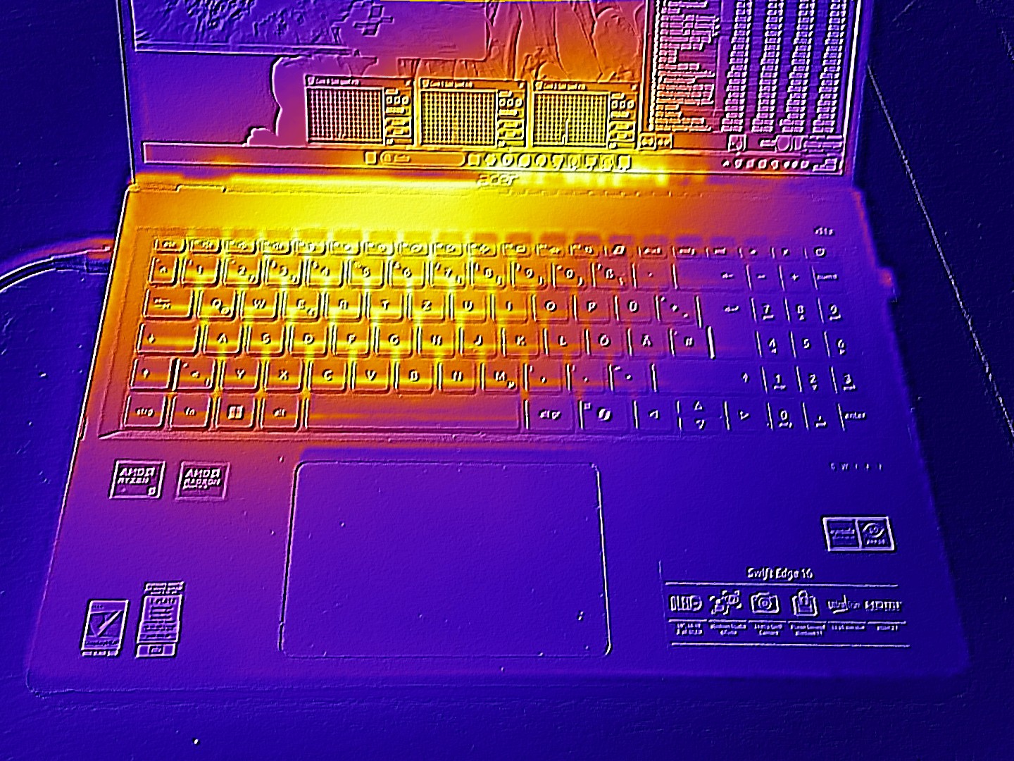 Die dünne Bauweise wirkt sich auch negativ auf die Temperaturen aus. Hier liegt das Swift Edge 16 im 3D-Betrieb mit maximal 48 °C auf der Oberseite und maximal 60 °C auf dem Gehäuseboden über den Vergleichsgeräten. Besser verhält es sich im Idle-Betrieb, zwischen 23 und 31 °C sind mehr als vertretbar.