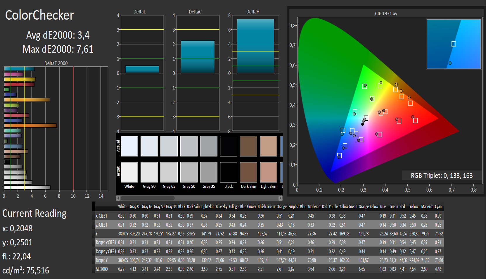 | Delta E Colorchecker * | 3.4 | 4.99 -47% | 3.17 7% | 4.27 -26% | 5.34 -57% |