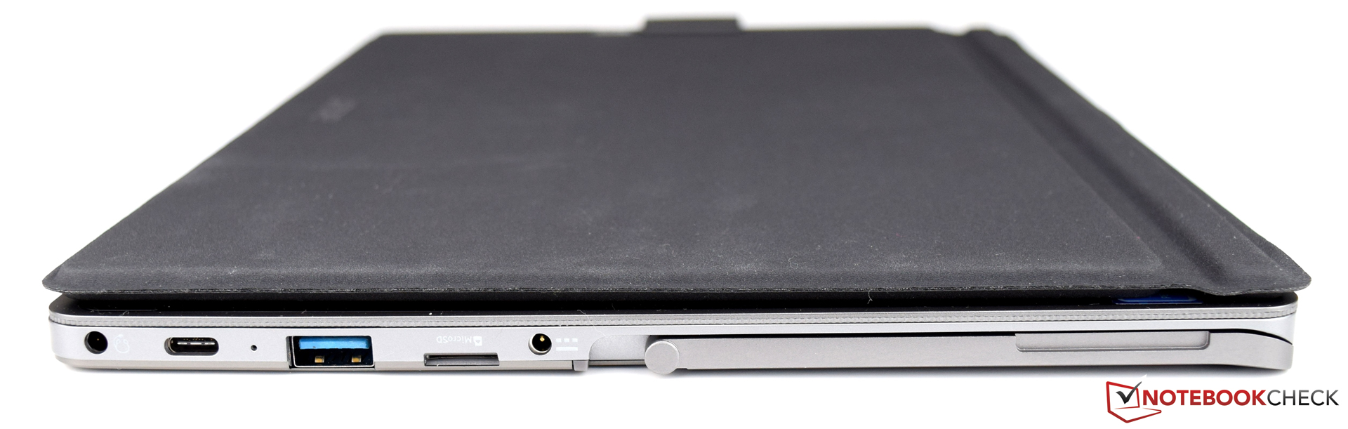 Alle Anschlüsse, welche das Acer Switch 3 zu bieten hat, befinden sich auf der linken Seite. Da der Standbügel schon die Hälfte des zur Verfügung stehenden Platzes beansprucht, müssen alle Schnittstellen auf der restlichen Fläche unterkommen. Gut ist der Einsatz des USB Typ-C-Anschlusses, wenngleich nur noch ein weiterer USB 3.0-Port vorhanden ist. Speicherkarten kann das Acer Switch 3 im Micro-SD-Format verarbeiten, wodurch sich der deutlich zu knappe interne Speicher von 64 GB erweitern lässt.