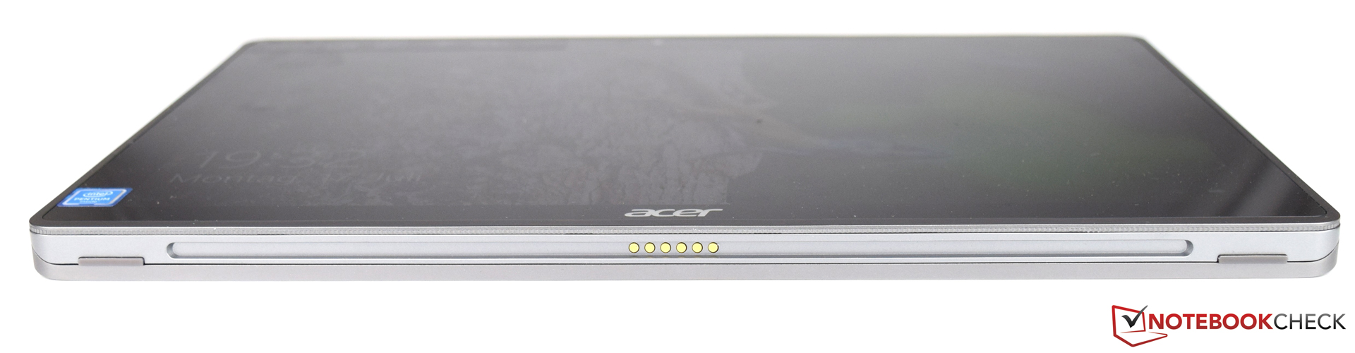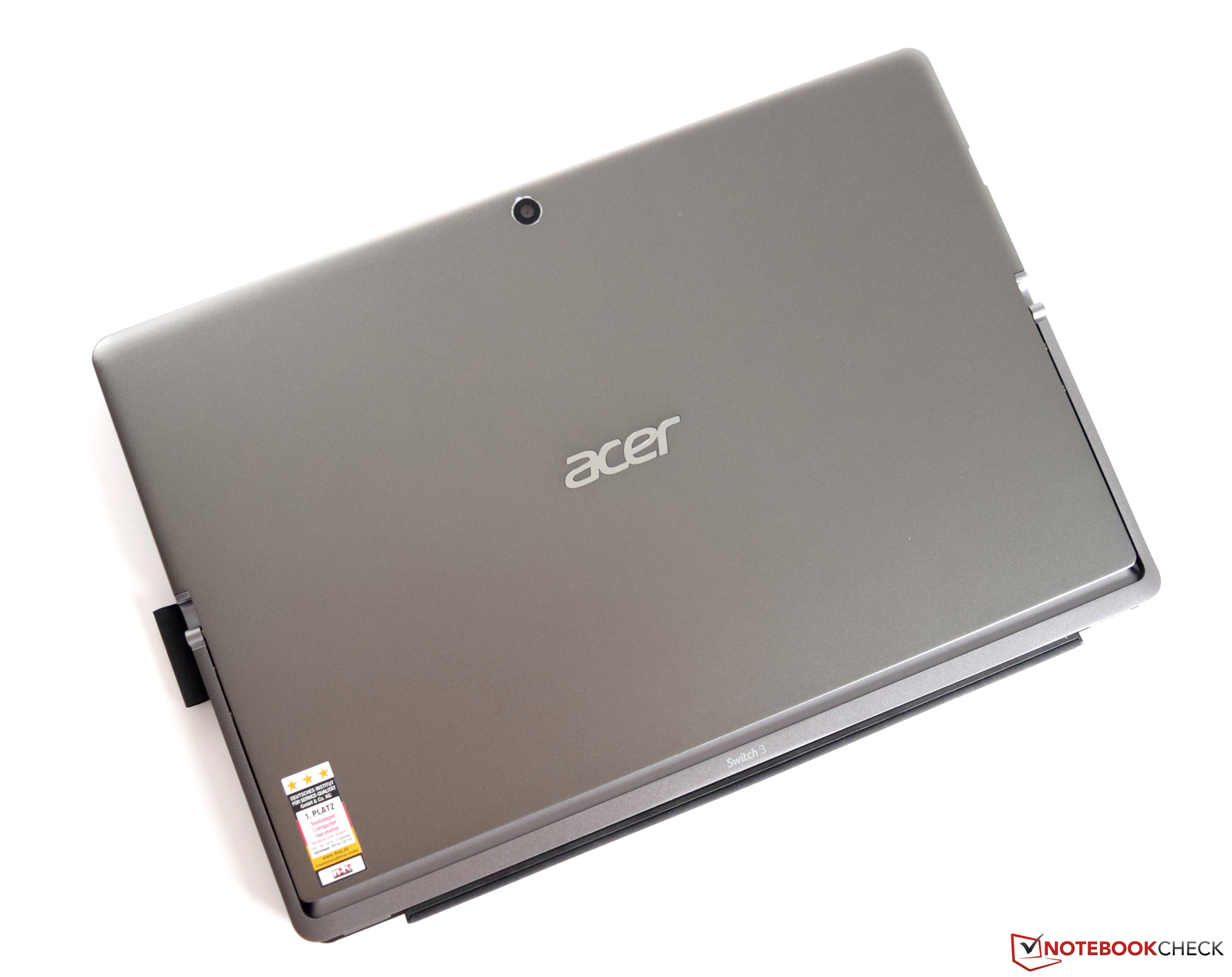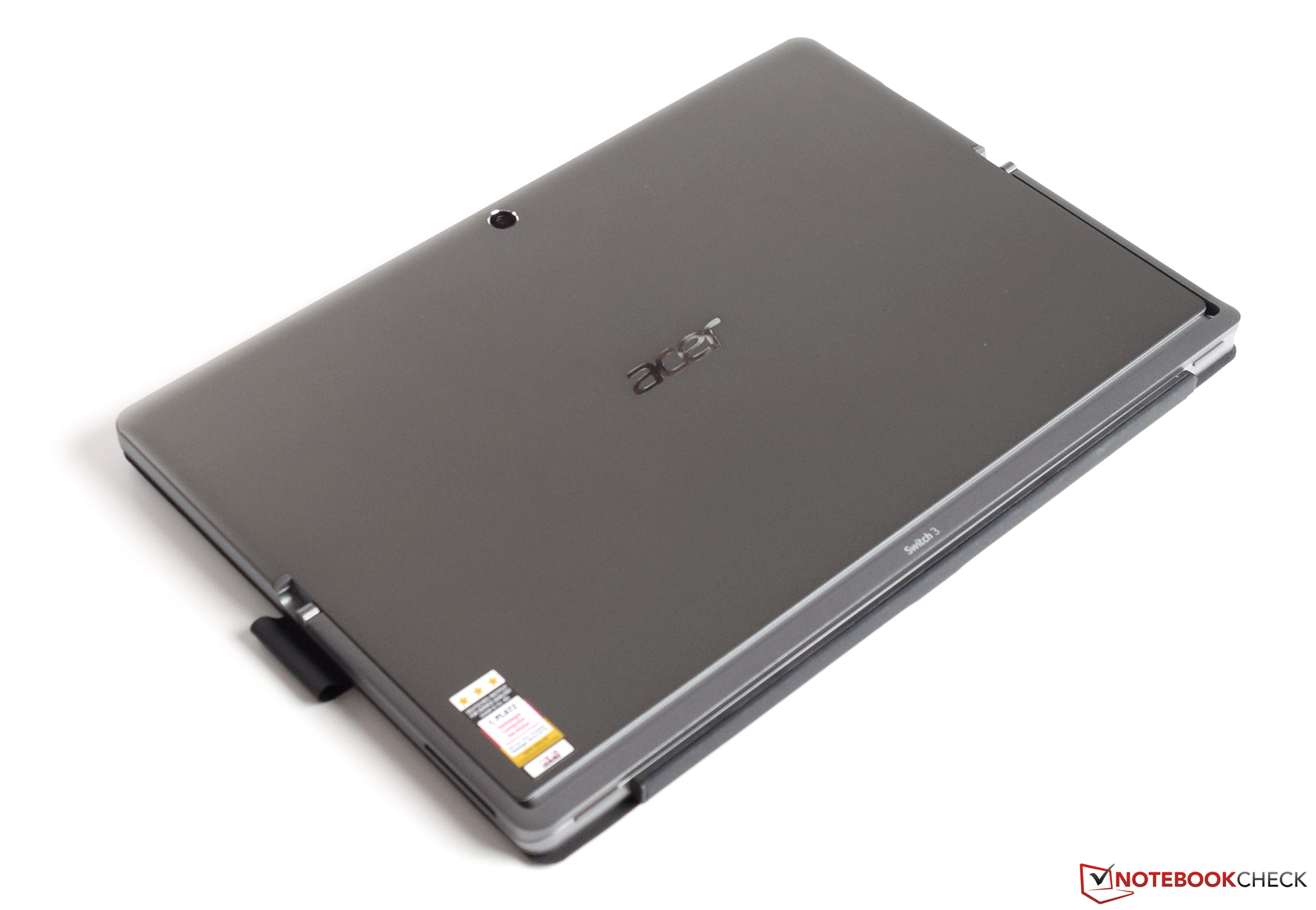 Das Tablet besitzt mit 29,5 x 20,1 Zentimetern eine angenehme Größe und wirkt nicht klobig. Auch gefällt uns der gut dimensionierte Rahmen, welcher das Festhalten des Tablets gut ermöglicht, ohne das Display zu berühren. Für den Laptop-Modus besitzt das Acer Switch 3 einen Metallbügel, welcher sich beliebig anpassen lässt.