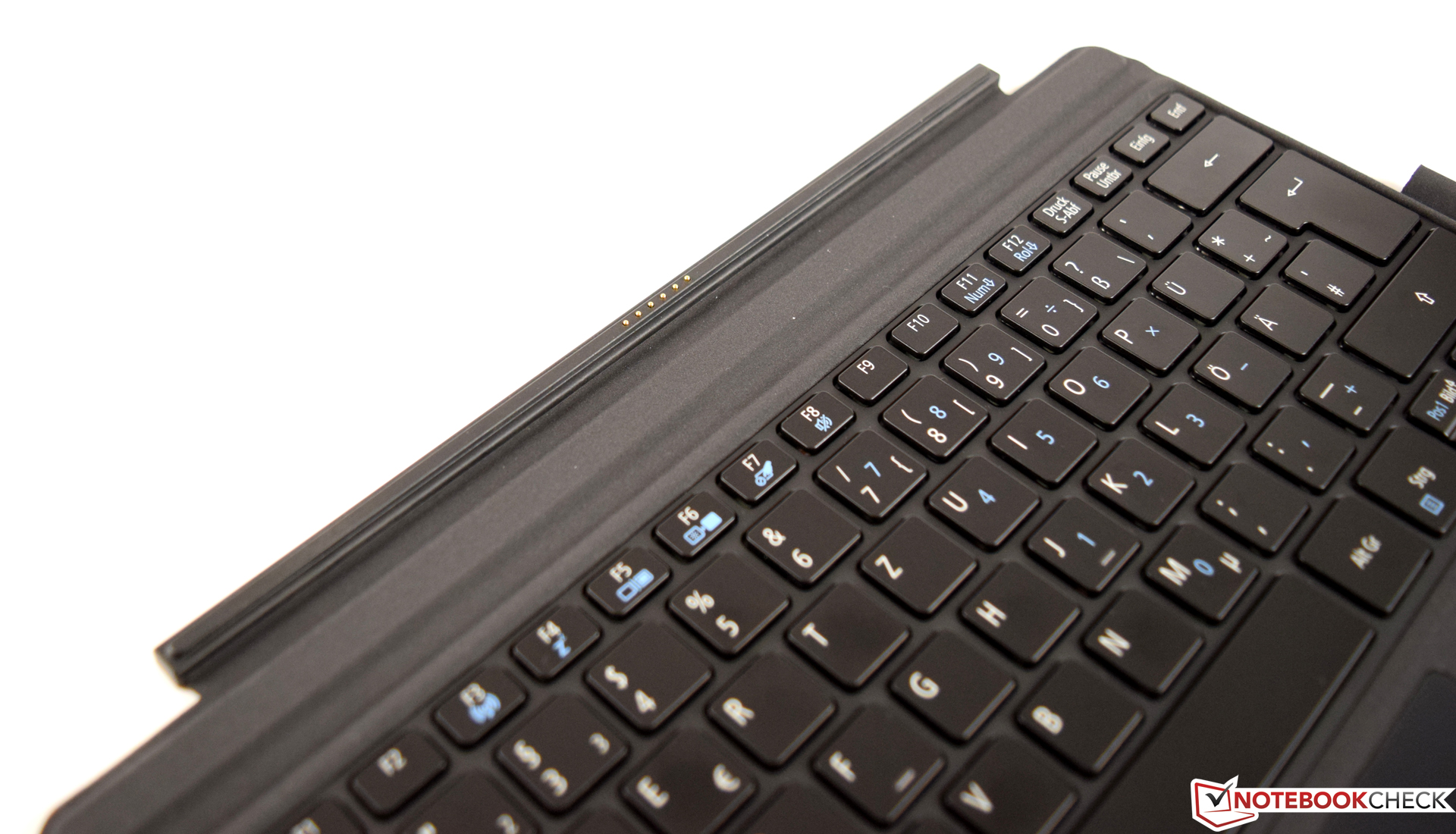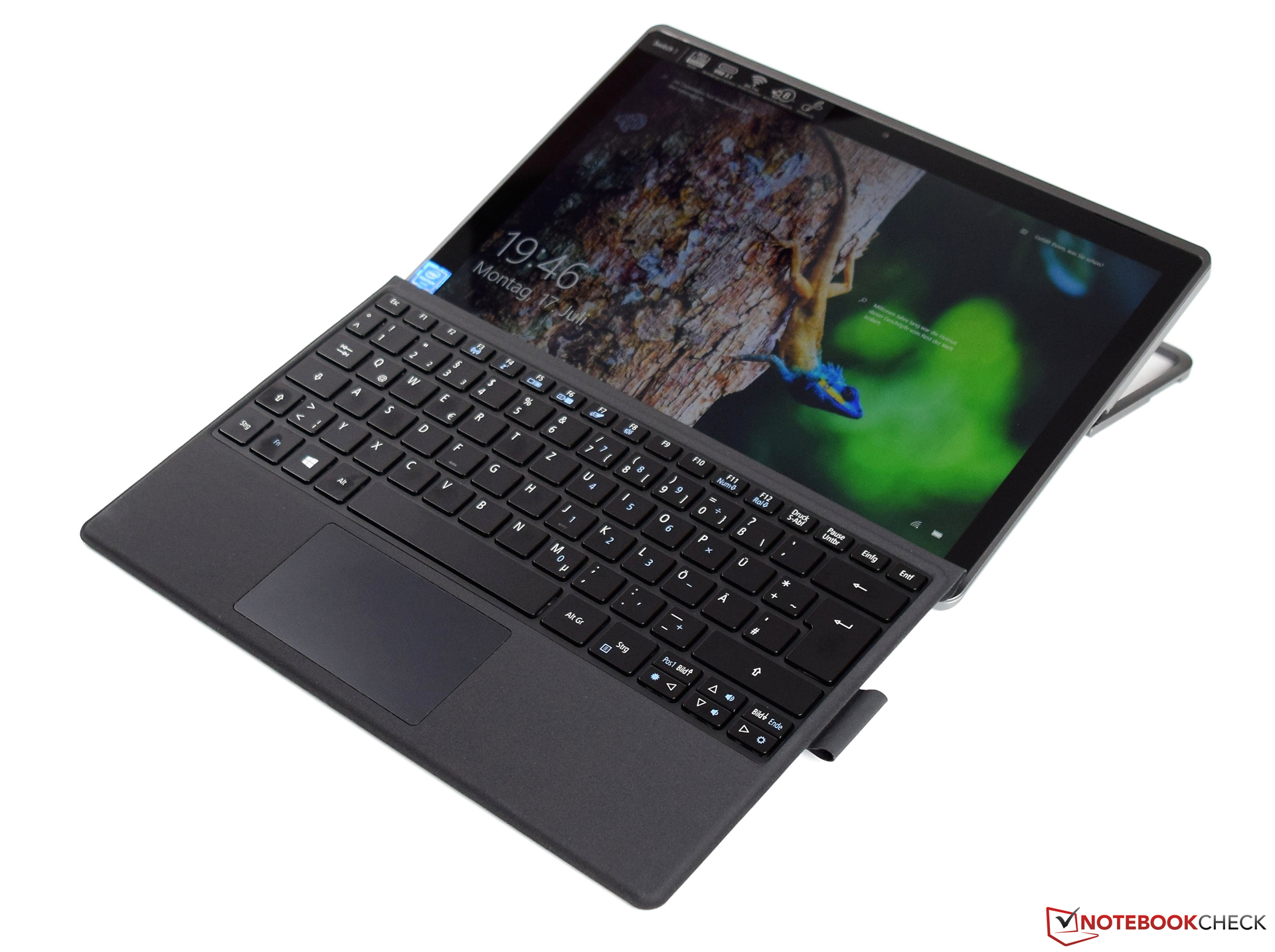 Das Acer Switch 3 wird mit einem Tastatur-Dock ausgeliefert, welches mit einer Magnetarretierung an der Unterseite des Tablets befestigt wird und dieses dann zu einem Laptop umfunktioniert. Einziges Manko, welches deutlich in die Wertung fällt, ist die fehlende Hintergrundbeleuchtung. Ansonsten verrichtet die Chiclet-Tastatur sehr gute Arbeit. Der geringe Hub und der spürbare Druckpunkt sorgen für ein angenehmes Schreibgefühl. Die Lautstärke beim Betätigen der Tasten ist angenehm leise. Nur die Leertaste wirkt etwas klapprig, was aber den guten Gesamteindruck nicht allzu sehr trübt.