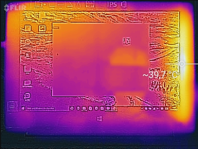 Unseren Stresstest (Prime95 und Furmark laufen für mindestens eine Stunde) bearbeitet das Convertible im Netz- und im Akkubetrieb auf die gleichen Weisen. CPU (480 MHz) und GPU (400 MHz) arbeiten von Beginn an mit niedrigen Geschwindigkeiten. Sonderlich stark erwärmt sich das Gerät nicht. Während des Stresstests wird nur an einem Messpunkt die Vierzig-Grad-Celsius-Marke überschritten.