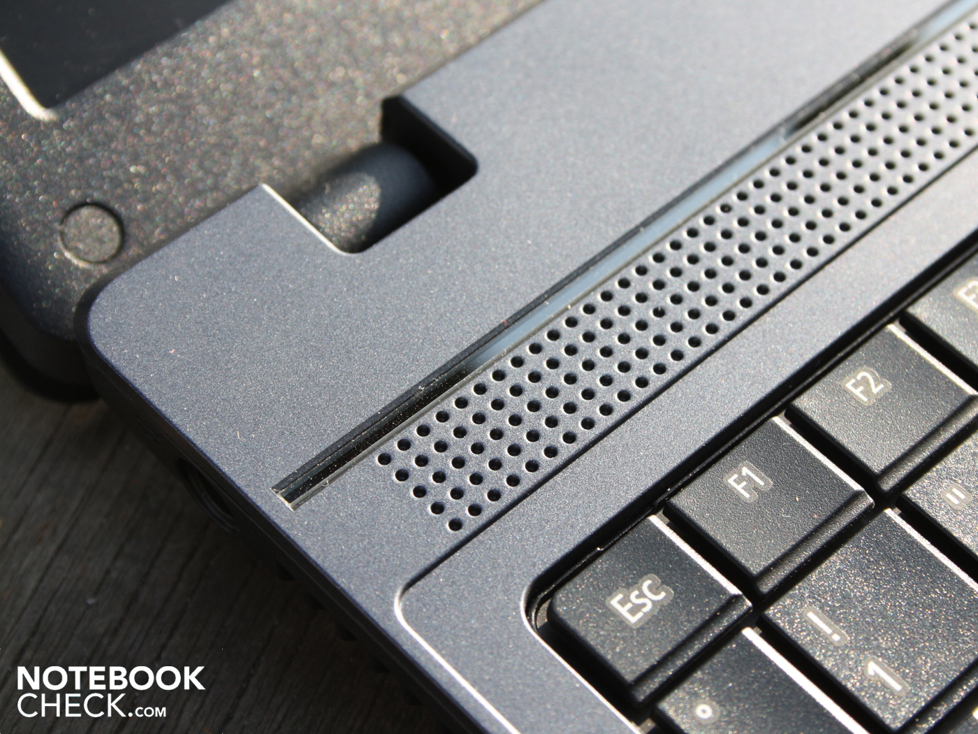 Die Stereo-Lautsprecher befinden sich über der Tastatur unter einer Leiste aus kleinen Löchern. Für einen Office-Laptop reicht das Klangbild, die Akustik eines guten Multimedia-Notebooks schafft es aber bei weitem nicht. Der Klang betont die Mitten, während Höhen und Tiefen (Bässe) vernachlässigt werden. Die Lautstärke ist relativ hoch. Wir testen die Soundausgabe mit zwei externen Yamaha Boxen (YST-M20SDP). Der vom Notebook anliegende Pegel ist recht hoch und gemäß einfacher Hörprobe rauschfrei.