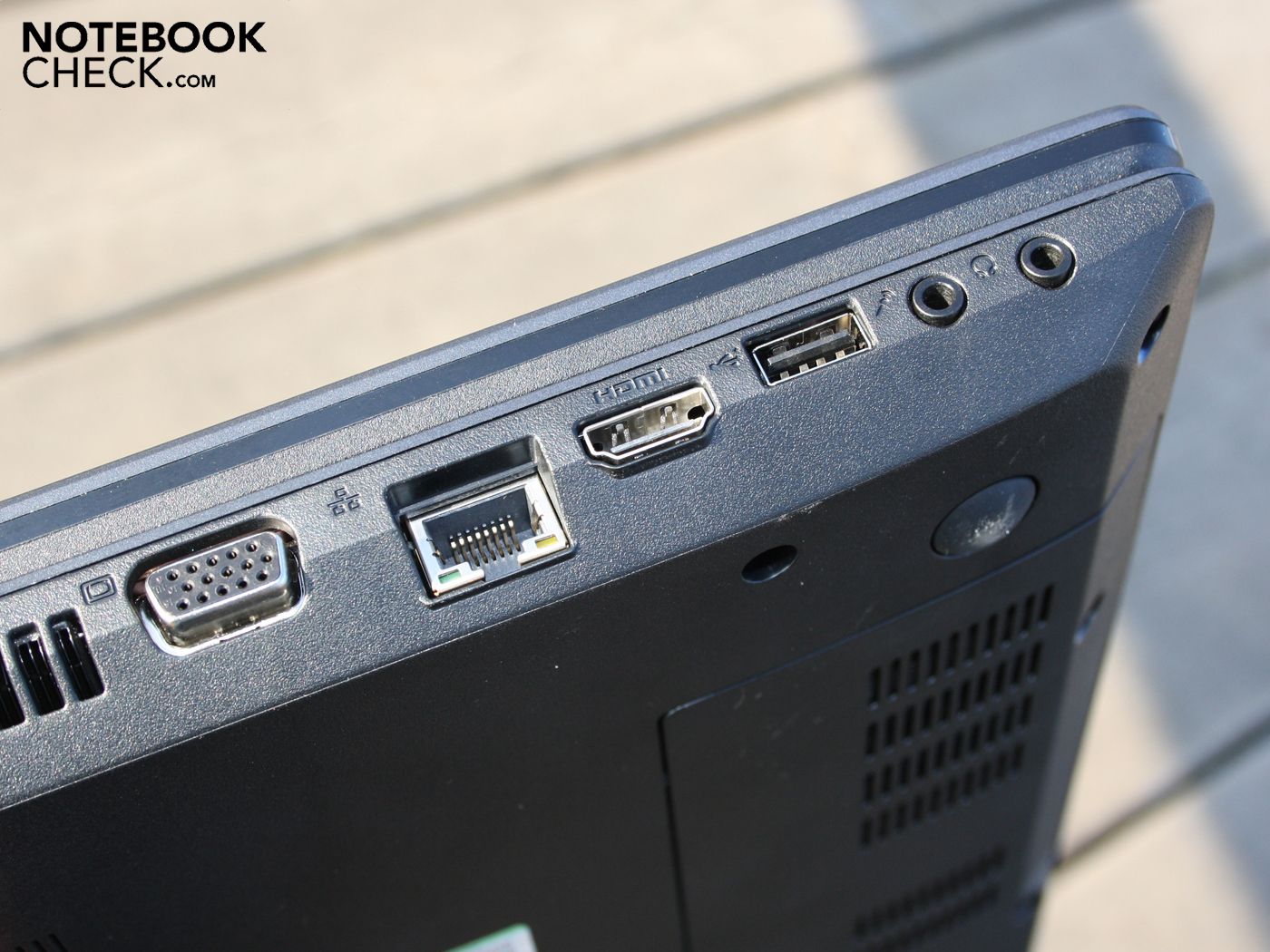 Die Position der rechten wie linken Anschlüsse ist nicht besonders sinnvoll. Steckende USB-, VGA- oder HDMI-Kabel behindern den Einsatz einer Maus und bringen Chaos auf den Schreibtisch. Rechts- wie Linkshänder sind gleichermaßen benachteiligt. Gerade ein Notebook, das in den meisten Fällen ständig auf dem Schreibtisch bleibt und dort den Hauptrechner spielt (Peripherie & TFT angeschlossen), sollte seine Haupt-Anschlüsse auf der Rückseite haben. Leider scheinen sich die wenigsten Hersteller nur auf die Optik („sunken hinges“; tief hängende Scharniere) und die plattformübergreifende Nutzbarkeit der Barebones zu konzentrieren. Details zur Nutzerfreundlichkeit fallen stets unter den Tisch.