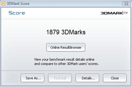 Der 3DMark 01 lief mit insgesamt 4213 Punkten noch relativ flüssig, wohingegen der 3DMark 03 mit 1879 Punkten und der 3DMark 05 mit 1003 Punkten meist deutlich vor sich hin ruckelten. Zum Vergleich: Nvidias G 102M ist mit 10749 Punkten (3DMark 01), 4360 Punkten (3DMark 03) und 2727 Punkten (3DMark 05) über das doppelte schneller. Von neueren 3DMark-Versionen haben wir aufgrund der schwachen grafischen Leistung abgesehen.
