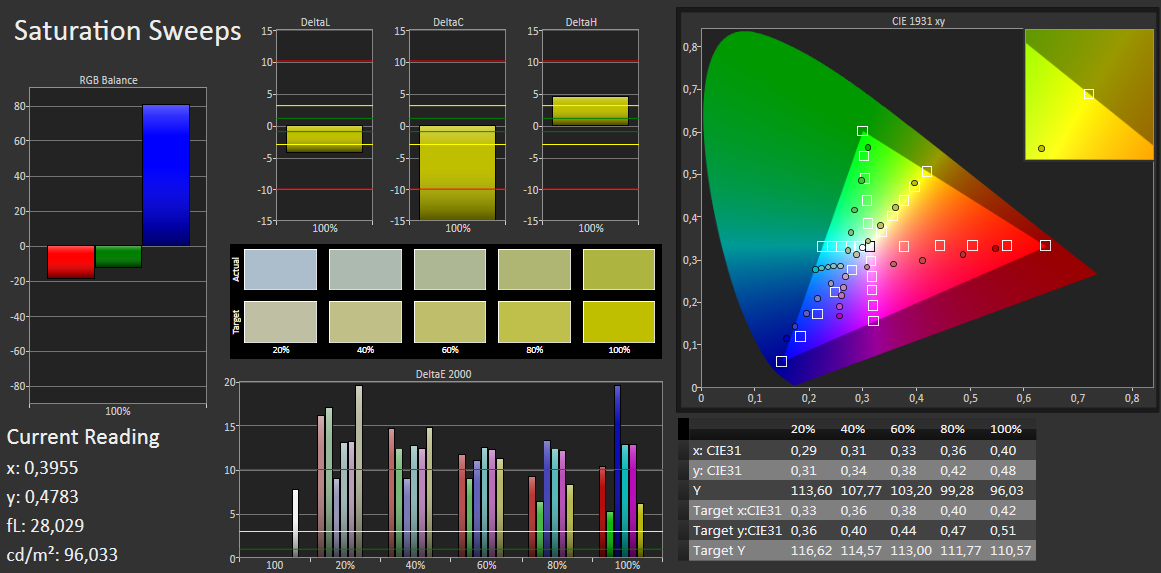 | AdobeRGB 1998 Coverage (%) | 43.46 | 41.25 -5% | 43.97 1% | 41.99 -3% | 39.98 -8% | |