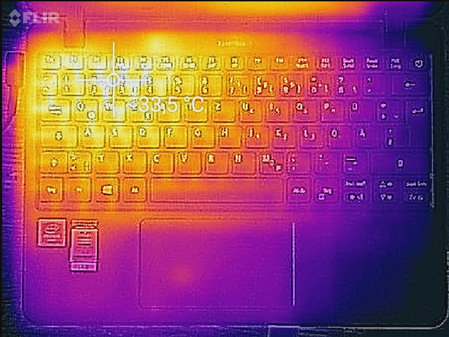 (+) Die Handballen und der Touchpad-Bereich sind mit gemessenen 29.8 °C kühler als die typische Hauttemperatur und fühlen sich dadurch kühl an.