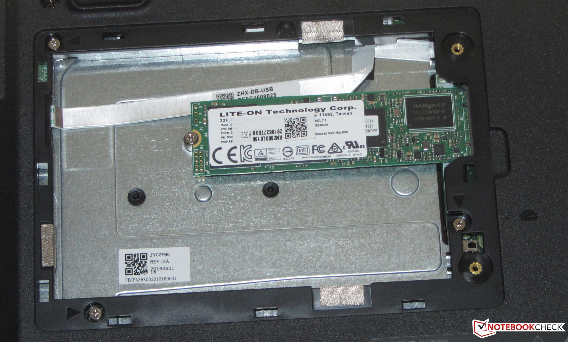 Das Travelmate hat eine Solid State der Firma Lite On an Bord. Es handelt sich um ein M.2-Modell (2280), das eine Speicherkapazität von 256 GB besitzt. Davon sind etwa 190 GB nutzbar. Der restliche Speicherplatz wird von der Windows Installation und der Recovery Partition belegt. Die Transferraten der SSD fallen gut aus