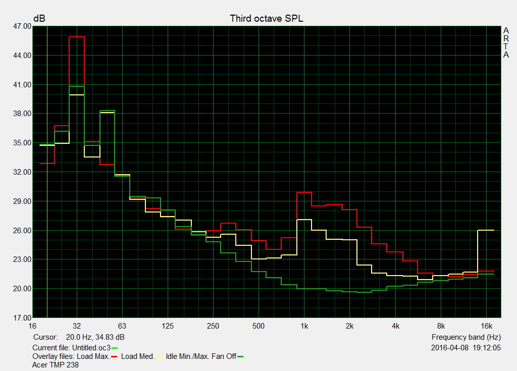Im Leerlauf steht der Lüfter des Travelmate oftmals still. Es herrscht dann Lautlosigkeit. Unter Last dreht der Lüfter nicht übermäßig stark auf. Während des Stresstests messen wir einen Schalldruckpegel von 38,1 dB - der Wert geht in Ordnung. Leider gibt das Notebook gelegentlich ein elektronisches Spratzeln von sich. Das tritt auf, wenn viele Daten auf der SSD bewegt werden.