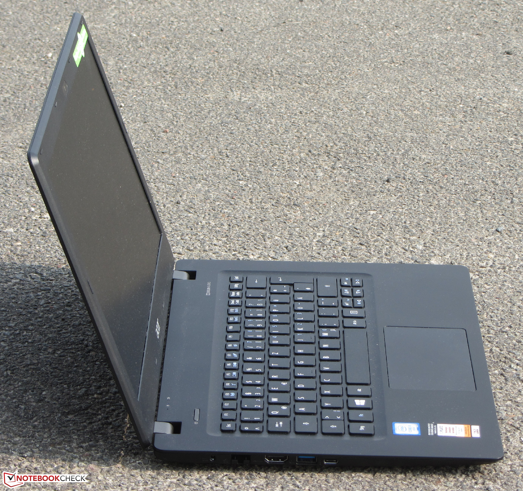 Das Travelmate ist mit einem blickwinkelstabilen TN-Panel bestückt. Somit kann der Bildschirm nicht aus jeder Position heraus abgelesen werden. Eine Veränderung des vertikalen Blickwinkels führt schnell zum Einbruch des Bildes. In horizontaler Richtung sieht es besser aus: Auch mehrere Personen können gleichzeitig auf das Display schauen. Der Rechner kann nicht wirklich im Freien genutzt werden. Allenfalls bei Bewölkung oder in schattigen Umgebungen besteht die Möglichkeit dazu.