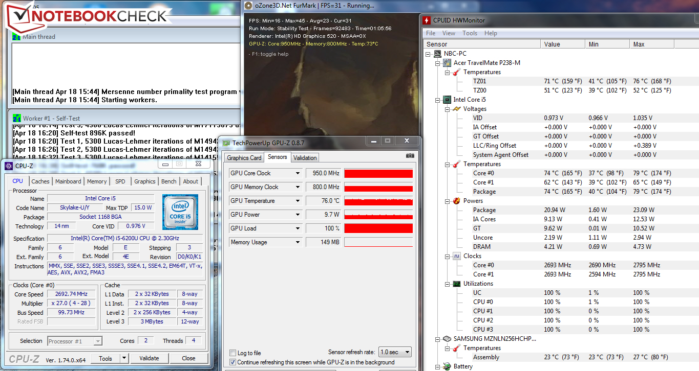 Unseren Stresstest (Prime95 und Furmark laufen für mindestens eine Stunde) durchläuft das Travelmate im Netz- und im Akkubetrieb auf die gleichen Weisen. CPU (2,7 GHz) und GPU (950 MHz) arbeiten mit voller Kraft. Da die CPU bei der Durchführung unserer CPU-Tests (Akkubetrieb) nur mit 1,8 GHz arbeitet, obwohl die Mess-Software etwas anderes aussagt, könnte dies auch im Stresstest (Akkubetrieb) der Fall sein. Wir gehen aber nicht davon aus. Sowohl die Temperatur- als auch die Lautstärkeentwicklung fallen im Netz- und im Akkubetrieb identisch aus. Zudem gibt es keinen Unterschied bei der subjektiv gemessenen Wärmeentwicklung des Rechners. Das Travelmate erwärmt sich insgesamt kaum. Während des Stresstests (Netzbetrieb) messen wir an einem Messpunkt eine Höchsttemperatur von 34,2 Grad Celsius.