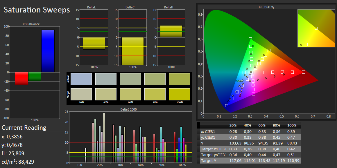 Auch auf Seiten der Farbdarstellung kann der Bildschirm nicht glänzen. Im Auslieferungszustand zeigt dieser eine DeltaE-2000-Farbabweichung von 13,15. Selbst viele Niedrigpreis-Notebooks erreichen nicht solch schlechte Werte. Anzustreben wäre in jedem Fall eine Farbabweichung kleiner 3. Darüber hinaus leidet das Display unter einem deutlichen Blaustich.