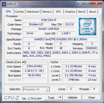 Im Inneren des Travelmate verrichtet ein Core i5-6200U (Skylake) Zweikernprozessor seinen Dienst. Unter den ULV-Prozessoren der Firma Intel stellt diese CPU das aktuelle Mittelklasse-Modell dar. Ihre Leistungsfähigkeit sollte den Anforderungen der meisten Nutzer mehr als genügen. Der Prozessor arbeitet mit einer Basisgeschwindigkeit von 2,3 GHz. Mittels Turbo ist eine Steigerung auf 2,7 GHz (beide Kerne) bzw. 2,8 GHz (nur ein Kern) möglich. Der Turbo kommt im Netzbetrieb zum Einsatz. Laut der von uns genutzten Mess-Software arbeitet der Prozessor auch im Akkubetrieb mit voller Kraft. Die Resultate in den von uns durchgeführten CPU-Tests sprechen dagegen. Werden die Resultate auf die Geschwindigkeit umgerechnet, geht der Prozessor im Akkubetrieb mit etwa 1,8 GHz zu Werke.