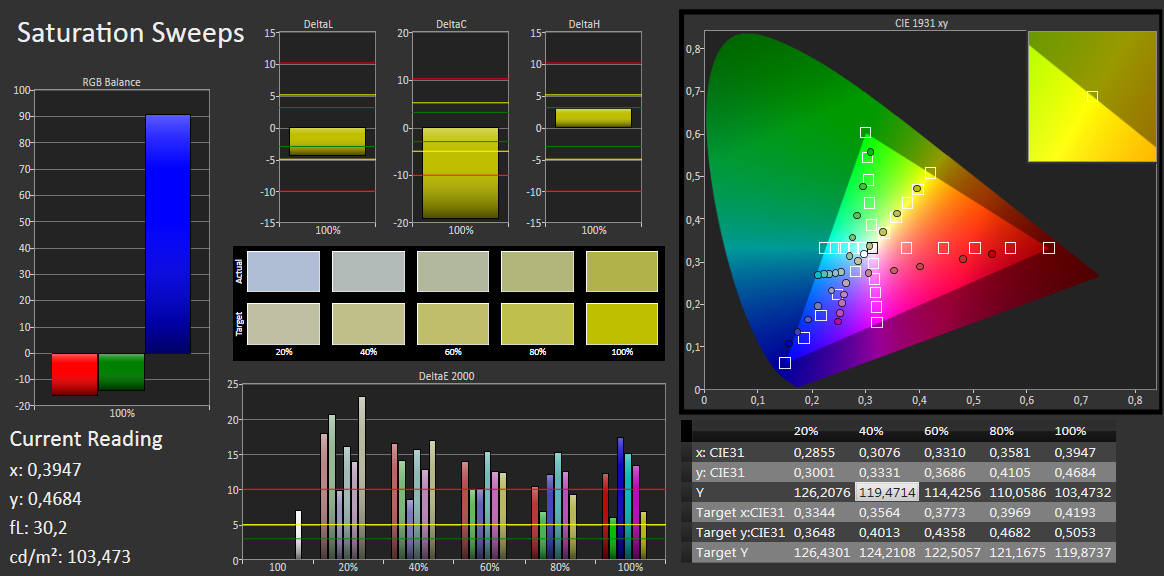 Wir haben das Panel im Auslieferungszustand mit einem Fotospektrometer vermessen und einen starken Blaustich festgestellt. Eine Kalibrierung war möglich, sie eliminierte den sichtbaren Blaustich. Die DeltaE-Farbabweichungen, das ist typisch für Low-Cost TN-Panels, liegen bei Werten von 11 bis 12. Auch das macht die Konkurrenz kaum besser; für eine geringe, nicht mehr mit dem Auge erkennbare Abweichung von der Referenz-Farbkarte müsste das DeltaE bei <3 liegen - und das schafft kein Konkurrent aus der Tabelle.