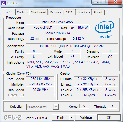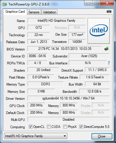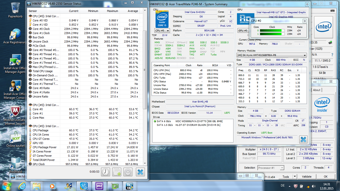 Der Intel Core i5 4210U (1,7 GHz, Turbo 2,7 GHz) ist im Travelmate nicht alternativlos, hier bietet Acer auch eine günstigere Variante mit Core i3 4005U. Unser Testgerät mit Core i5 und 500-GB-HDD dürfte mit der Low-Voltage-CPU eine gute Anwendungsleistung einfahren, mit der Nutzer für viele Jahre gut gerüstet sind. Dazu gesellen sich 4 GB Arbeitsspeicher von Hynix im Single-Channel-Betrieb (ein Modul) und die integrierte Intel HD Graphics 4400. Letztere sorgt nicht für Performance-Wunder, sie hält den Energieverbrauch bzw. die Abwärme aber niedrig.