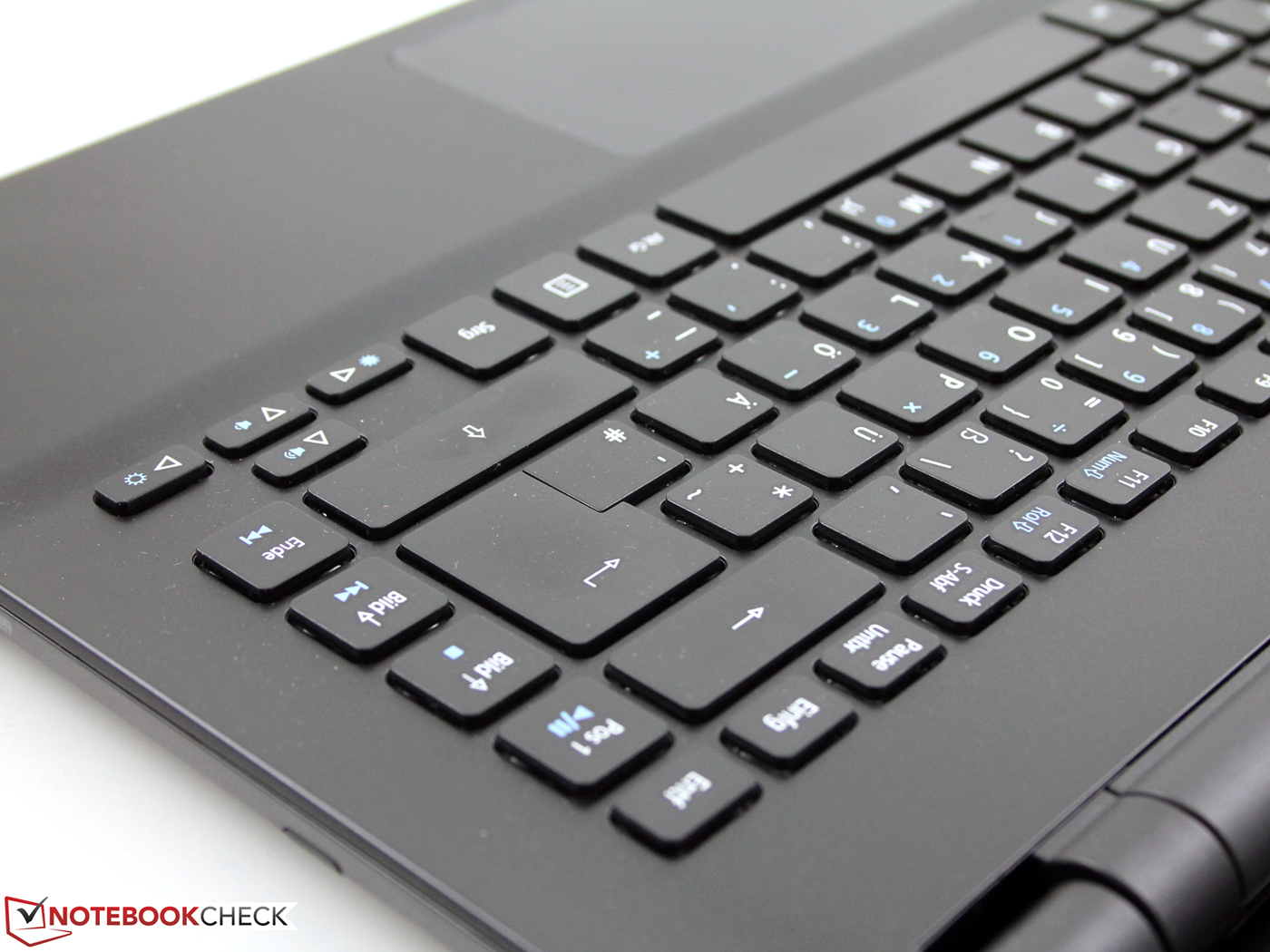 Die Tasten liegen in einer flachen Wanne, die konisch auf die Ränder zuläuft. Das Tastenbett wippt im linken Bereich ganz dezent, hier erscheint der Anschlag dann etwas klapprig. Die rechte Seite liegt hingegen fest auf, hier ist der Anschlag fest. Der Hubweg fällt für eine Laptop-Tastatur groß aus, zwei Millimeter stellen wir nur bei sehr wenigen Testgeräten fest. Leider sind die Tasten etwas rutschig, weshalb mangels konischer Wölbung die Zielgenauigkeit der Finger leidet. Layout und Beschriftung gefallen uns hingegen sehr gut, wichtige Tasten sind stark vergrößert (Enter, Space, Shift), und die Richtungstasten sind abgesetzt, wenn auch verkleinert. Typisch für 14 Zoll ist das Fehlen eines Ziffernblocks. Dieser kann behelfsweise per Fn-Taste über einige mehrfach belegte Buchstabentasten simuliert werden.