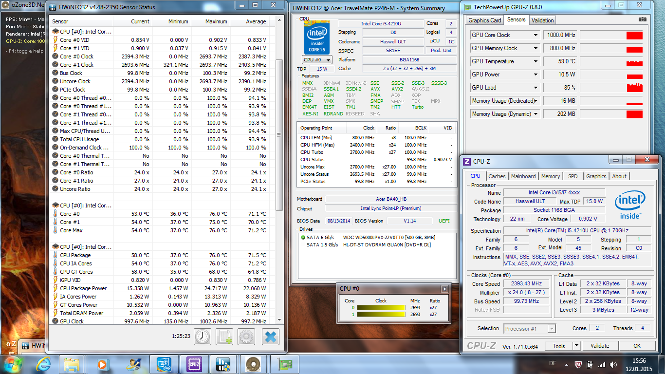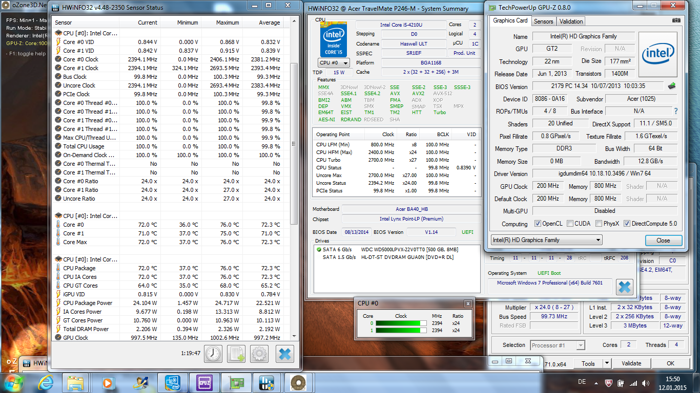 Wie oben gezeigt fährt der Core i5 seinen Turbo unter Last voll aus (2,4 GHz). Dies ist auch während des Stresstests der Fall, hier liegt der volle Takt konstant an, auch nach zwei Stunden Dauerlast. Die internen Temperaturen am SoC steigen dieweil auf höchstens 76 Grad. Hier hat der Hersteller ein gutes Kühlsystem aufgebaut, zumal von den 76 Grad kaum etwas auf den Oberflächen ankommt. Auf der Oberseite messen wir als „Hotspot“ gerade mal 35 Grad, unten sind es 30 Grad. Die HD 4400 ist unter Stress mit 1.000 MHz aktiv, diesen Takt hält die GPU auch dann, wenn der CPU-Teil unter Höchstlast steht.