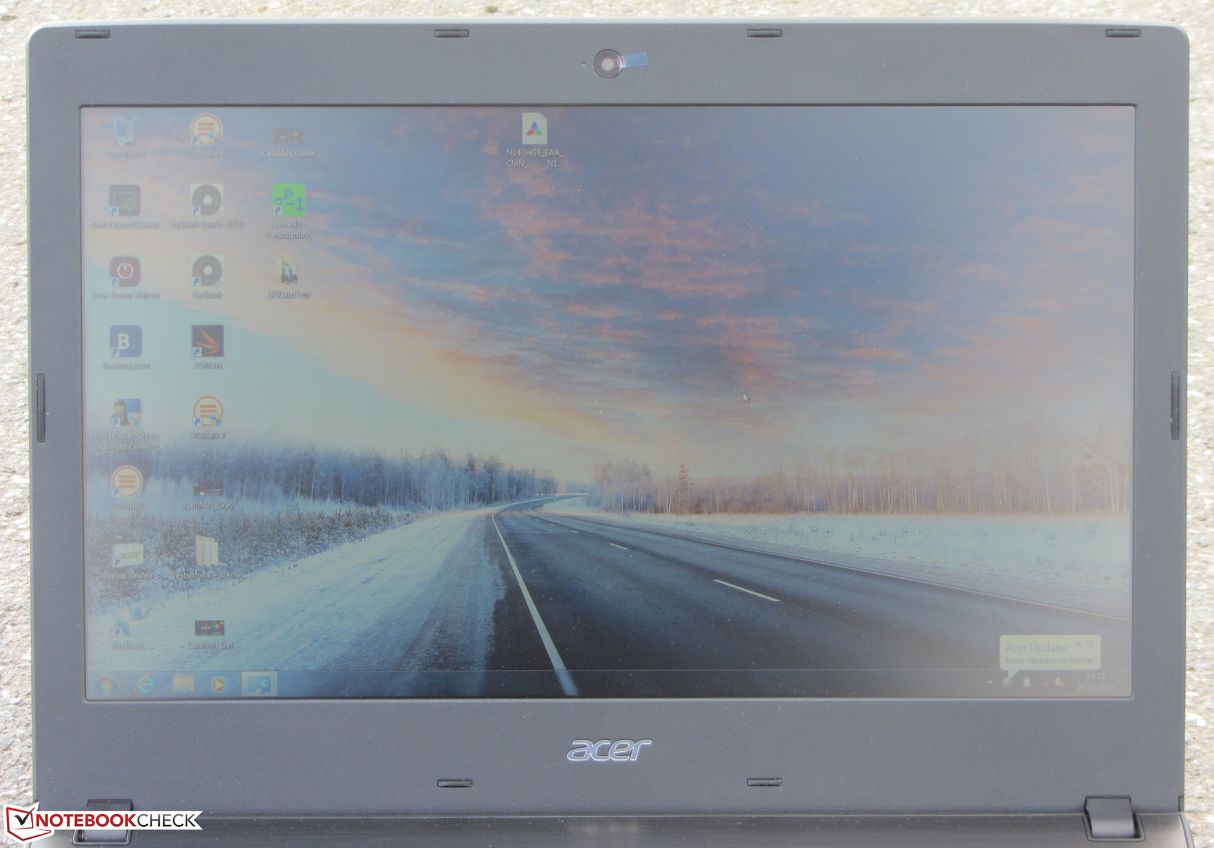 Überraschenderweise stattet Acer das Gerät nicht mit einem IPS-Panel aus, sondern mit einem blickwinkelinstabilen TN-Modell. Somit kann der Bildschirm nicht aus jeder Position heraus abgelesen werden. Allerdings handelt es sich um ein Modell der besseren Art. Die Blickwinkel fallen etwas größer aus als bei TN-Bildschirmen aus dem Tiefstpreissegment. Das Travelmate kann im Freien genutzt werden, wenn die Sonne nicht allzu hell strahlt.