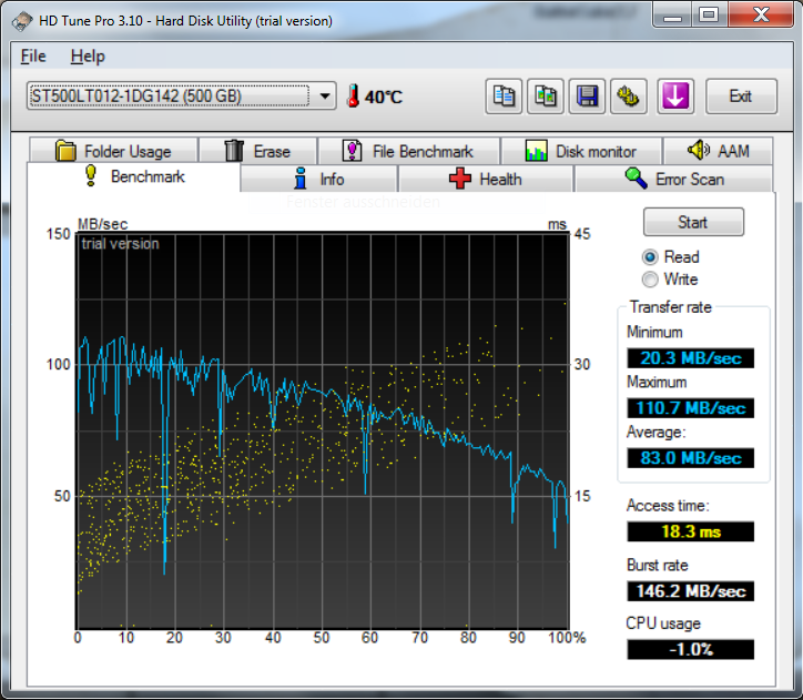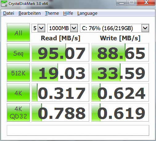Wie oben erwähnt, agieren die alle mit 5.400 rpm drehenden Festplatten der drei Kandidaten in jeder Einzeldisziplin des CrystalDiskMark 3.0 auf Augenhöhe und insgesamt auf einem soliden, wenn auch nicht sehr hohen Niveau. Die Datenrate beim sequenziellen Lesen liegt im Durchschnitt, wenn man schneller drehende Platten wie die in einigen Notebooks verbaute Hitachi Travelstar Z7K500 HTS725050A7E630 (7.200 rpm, +25 %) außen vor lässt. Allerdings schafft die gleiche Platte wie im Testgerät im Dell Inspiron 15-3531 einen 17 % höheren Durchsatz. Beim Einlesen kleiner, verteilter Datenblöcke (4k, 4k QD32) wie bei Programm- und Betriebssystemstarts schwächelt die Seagate Momentus Thin ST500LT012-1DG142 noch deutlicher, hier liegt der Vorsprung anderer Notebooks mit identischem Massenspeicher bei bis zu 55 %. Insgesamt ist die Leistung in diesen Einzeltests unterdurchschnittlich.
