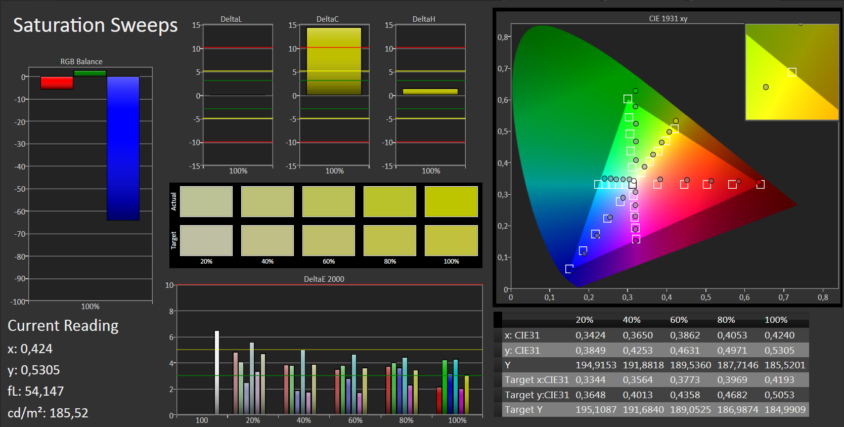 Im Auslieferungszustand zeigt der Bildschirm eine durchschnittliche DeltaE-2000-Abweichung von 4,07. Damit scheitert er nur knapp am Zielbereich (DeltaE kleiner 3). Einen Blaustich zeigt das Display nicht.
