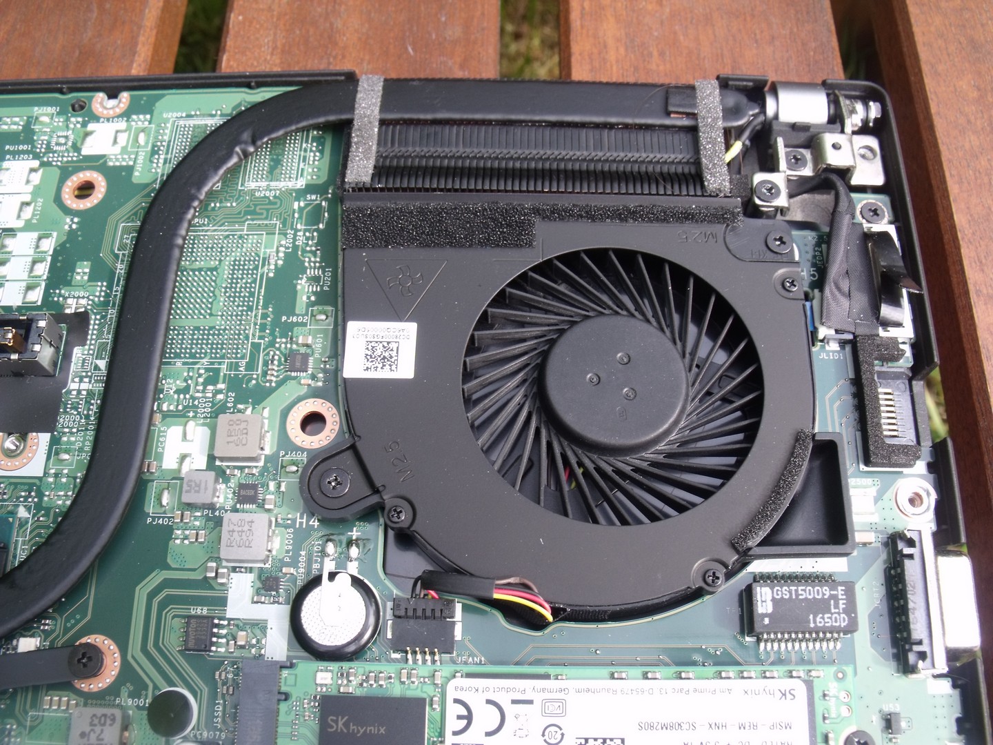 Über eine Wartungsklappe an der Unterseite des Notebooks ist der Zugriff auf die zusätzliche Festplatte und eine freie Speicherbank möglich. Die bereits installierten 8 GB Arbeitsspeicher sind fest verlötet. Die übrigen Hardwarekomponenten erreicht man durch das Entfernen der Bodenplatte. Sind 15 weitere Schrauben gelöst, lässt sich diese sehr leicht abheben. Danach kann der Akku getauscht oder der Lüfter gereinigt werden. Die CPU ist ebenfalls verlötet.