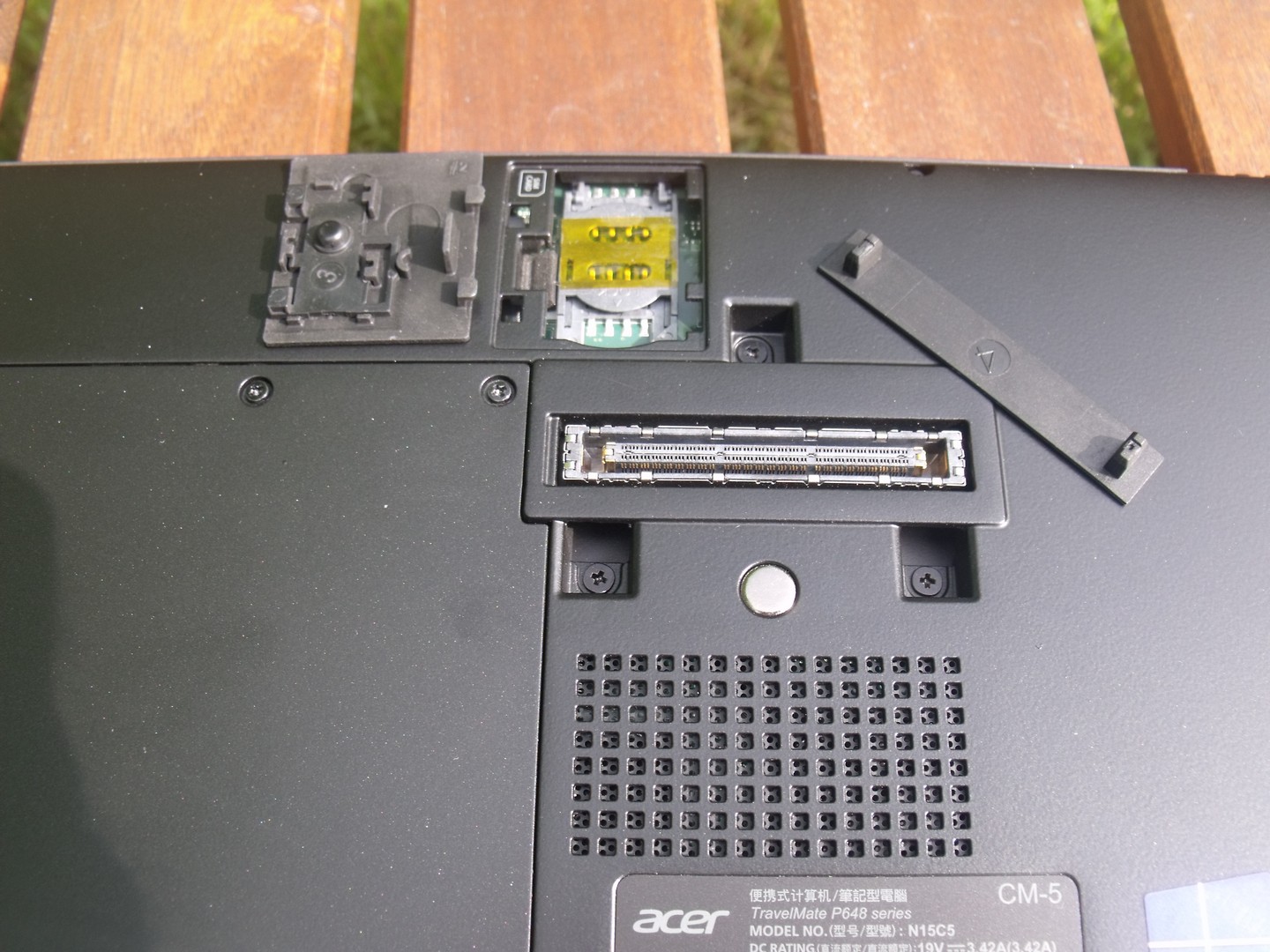 Auf der Unterseite des Geräts befinden sich ein Micro-SIM-Karteneinschub, der Anschluss für das Acer ProDock (Dockingstation) und Lautsprecher. Über eine mit Schrauben gesicherte Klappe können die Festplatte und der Arbeitsspeicher ausgetauscht bzw. erweitert werden. Der Akku ist nur erreichbar, wenn die Bodenplatte komplett entfernt wird.
