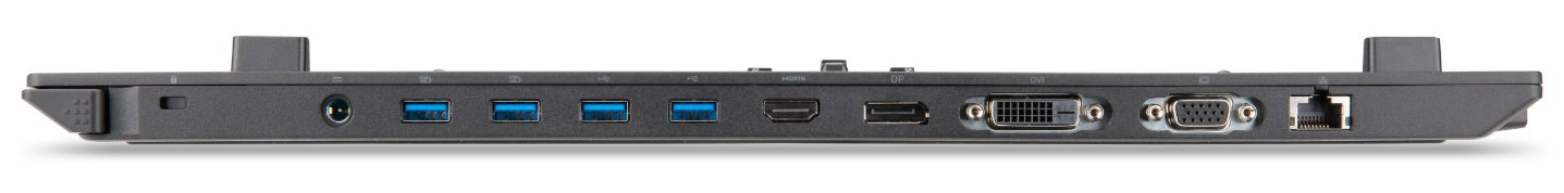 Acer liefert eine stimmige Auswahl an Schnittstellen. Der Rechner hat zwei Videoausgänge (VGA, HDMI) zu bieten, dazu gesellen sich drei USB-3.0-Anschlüsse. Neu hinzugekommen ist ein Thunderbolt-3-Steckplatz. Hierbei handelt es sich sozusagen um eine universelle Schnittstelle, die USB-3.1-Funktionalität bereitstellt und mittels eines Adapters in einen Displayport verwandelt werden kann. Die Anzahl der Schnittstellen kann noch erweitert werden. Auf der Unterseite des Rechners findet sich ein Dockingport. Acer führt entsprechende Dockingstationen im Sortiment.