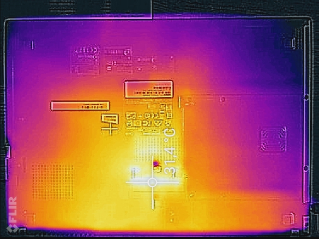 (+) Die Handballen und der Touchpad-Bereich sind mit gemessenen 27.8 °C kühler als die typische Hauttemperatur und fühlen sich dadurch kühl an.