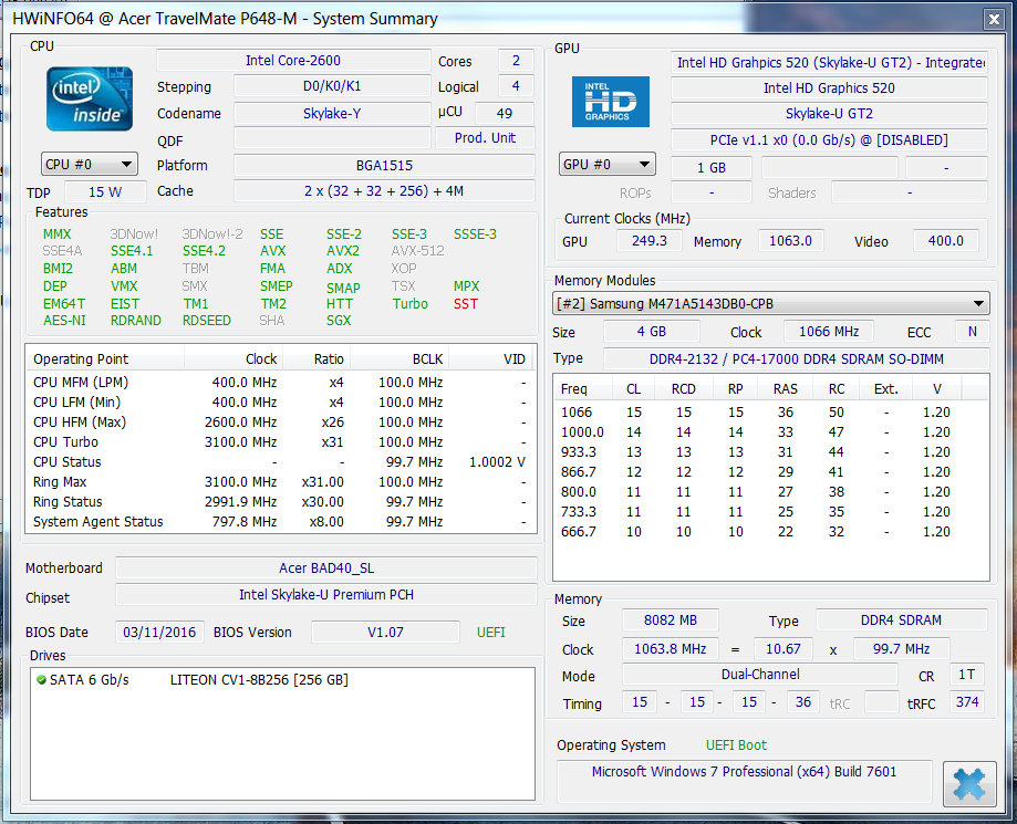 Angetrieben wird das Travelmate von einem Core i7-6500U (Skylake) Zweikernprozessor der Firma Intel. Hierbei handelt es sich um einen der stärksten ULV-Prozessoren (TDP: 15 Watt), die Intel aktuell im Sortiment hat. Er bietet genügend Rechenleistung für alle gängigen Anwendungsszenarien. Für viele Nutzer könnten sich aber Travelmate Modelle, die mit Core i5-6200U Prozessoren bestückt sind, als geeigneter erweisen. Der nur etwas geringeren Rechenleistung steht ein um 100 bis 150 Euro niedrigerer Kaufpreis entgegen.