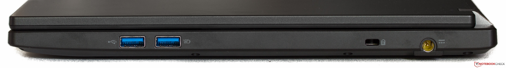 Ausgerechnet auf den rechten Seite (Rechtshänder) hat Acer zwei USB-Ports so weit vorne platziert, dass bei Benutzung einer externen Maus eingesteckte Sticks und Kabel stören können. Links verteilen sich die Anschlüsse um die Mitte der Seite herum.