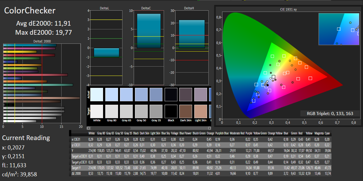 | Colorchecker dE 2000 max. * | 10.19 | 19.77 -94% | 15.13 -48% | 14.39 -41% | 8.13 20% |