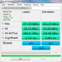 Acer setzt auf eine über SATA 3 angebundene SSD von Kingston mit 256 GB. Die sequenziellen Transferraten liegen liegen laut AS SSD am schnittstellenbedingten Limit von gut 500 MB/s und laut CrystalDiskMark 3.0 etwas darunter. Gut, wenn auch nicht sehr gut fällt die Leistung beim Einlesen kleiner, verteilter Blöcke (4K Read) aus. Hier sind 30 MB/s ein guter Wert, den die Kingston-SSD je nach Benchmark leicht unter- oder überschreitet. Insgesamt kann die Performance der SSD als gut durchschnittlich bezeichnet werden.