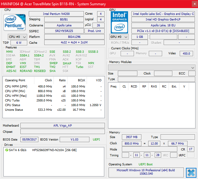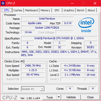 Der Intel Pentium N4200 ist ein Quad-Core-Prozessor auf Basis der Intel Apollo-Lake-Architektur. Als eine CPU auf Intel Atom-Basis ist sie für Notebooks ideal, bei denen vor allem der möglichst niedrige Preis wichtig ist. Weder die vier Kerne noch der Turbotakt von 2,5 GHz (Grundtakt 1,1 GHz) sollten täuschen: Der Prozessor ist nur für sehr wenig fordernde Aufgaben geeignet. Dafür ist allerdings auch die TDP mit 6 W ziemlich niedrig.