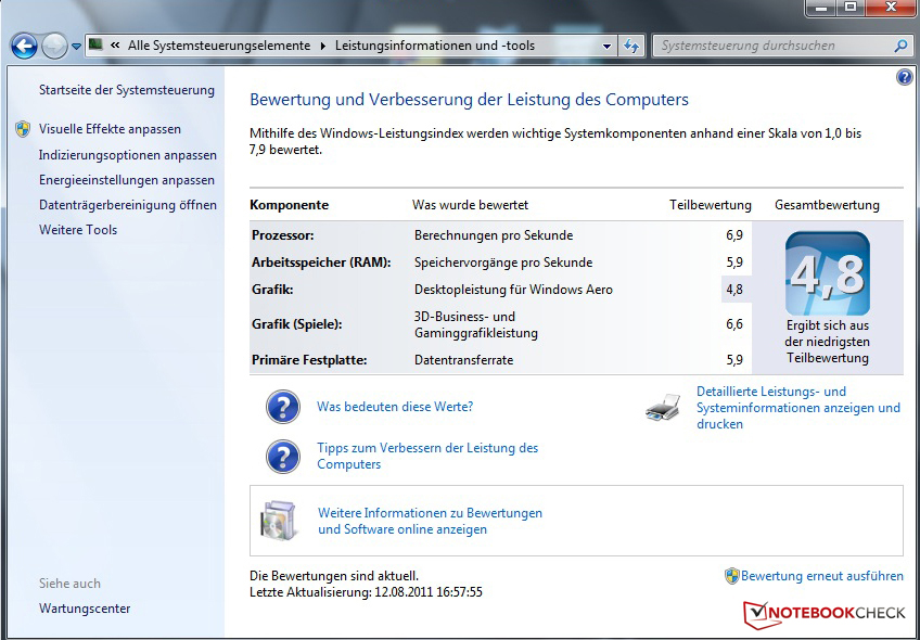 Ein kleines Resümee ermöglichen umfassende Systembenchmarks, die anhand von zahlreichen Kriterien und Messungen einen Überblick ermöglichen. Im frischen PCMark 7 erreicht die Testkonfiguration ein Ergebnis von 1766 Punkten und liegt damit im Mittelfeld unserer Datenbank, wobei keine größere Abweichung zu ähnlichen Konfigurationen zu erkennen ist. Insgesamt eine gute Multimedia-Performance, die mit einem Solid State Drive in die Höhe getrieben werde könnte.