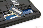 Ein Blick an die Geräteunterseite überzeugt. Unter der größten Wartungsabdeckung, die von fünf Schrauben gehalten wird, finden sich das Speichermedium, zwei Bänke für DDR3-Arbeitsspeicher und Platz für ein UMTS-Modul. Allerdings fehlen die notwendigen Antennen und der Steckplatz für das Modul, wodurch ein nachträglicher Einbau nicht möglich ist. Unter einer sehr kleinen Abdeckung findet sich das WLAN-Modul mit zwei Antennen, deren Enden über dem Bildschirm angebracht sind. Der integrierte Dockingport für ein Acer ProDock, und die Möglichkeit das DVD-Laufwerk über einen Schiebemechanismus schnell austauschen zu können, überzeugen.