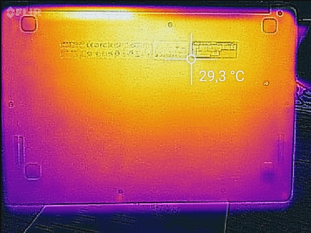 Die Temperaturentwicklung des X349 ist erfreulich niedrig. Sie bewegt sich im Idle-Betrieb bei maximal 27 °C an der Unterseite. Unter Last können im hinteren Bereich bis zu 38 °C erreicht werden. Das ist dann schon deutlich spürbar, sollte aber keinesfalls unangenehm werden. Im Bereich der Handballenauflage übersteigt die Temperatur zu keiner Zeit die 30-°C-Marke. Das deckt sich mit den Benchmark-Messungen, die jederzeit Volllast erreichen können. Die Kühlung funktioniert also offenbar gut. Im Vergleich zum Vorgänger konnten die Durchschnittstemperaturen nochmals leicht gesenkt werden.