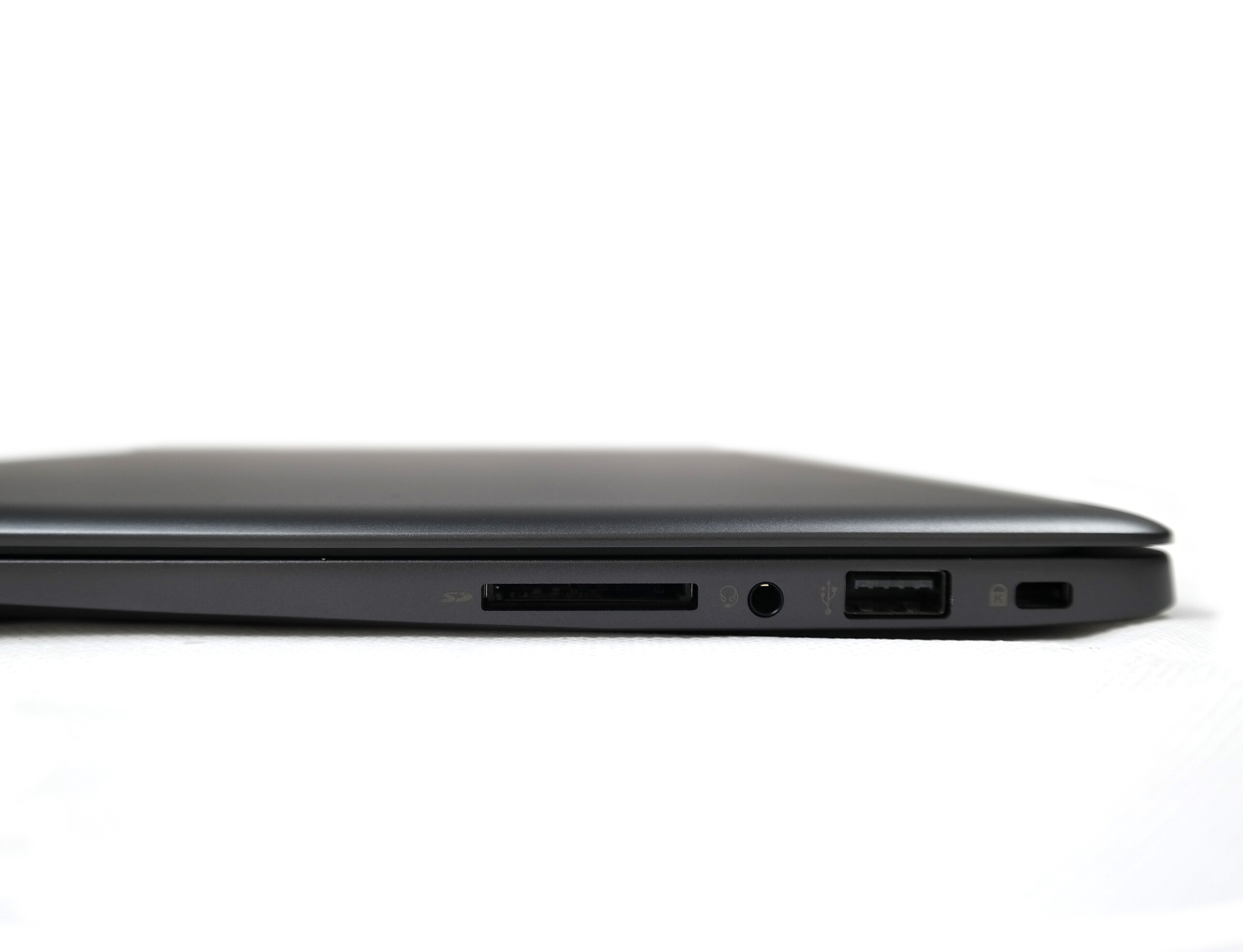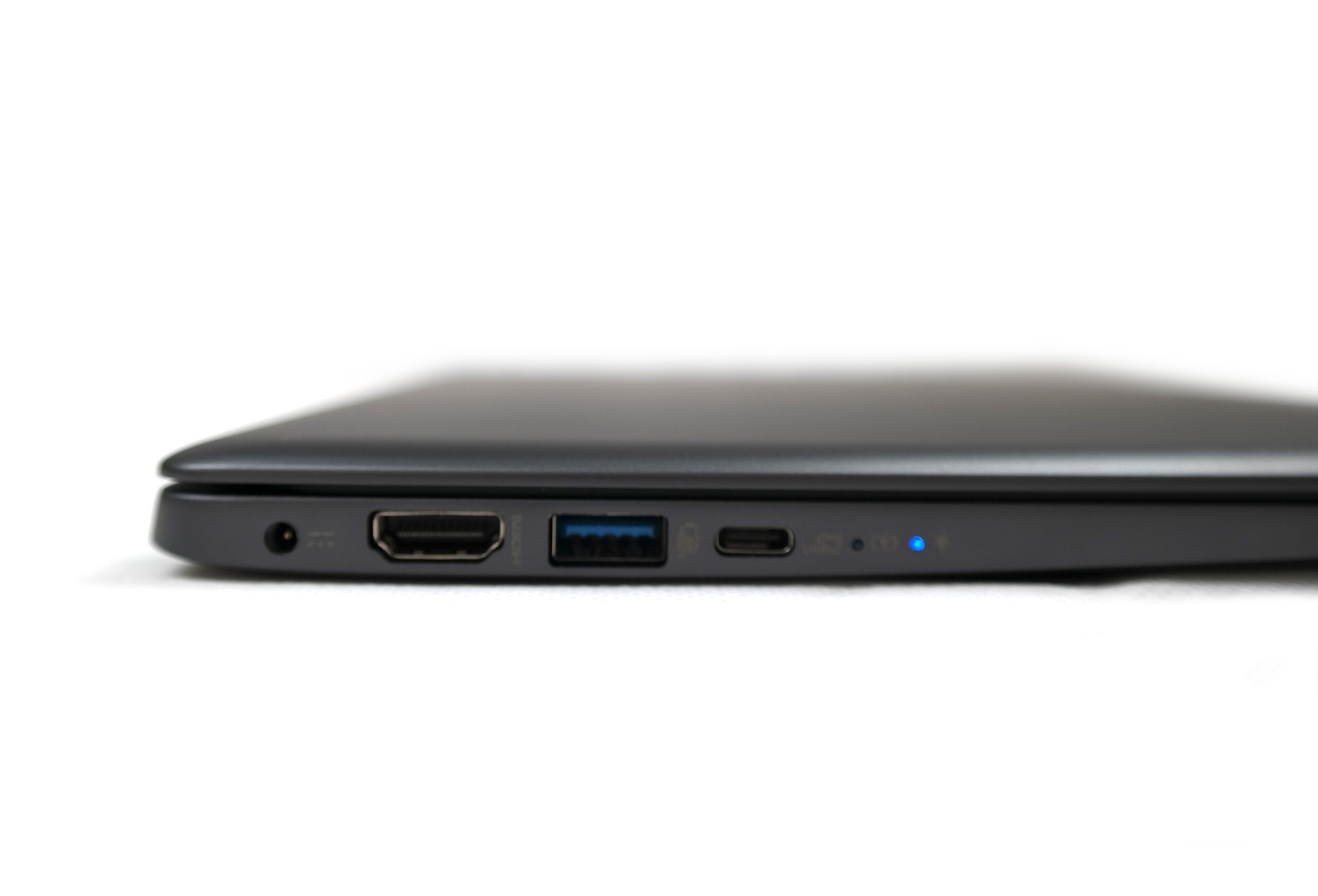 Für ein flaches Notebook ist das X349 ausreichend bestückt. Während es auf der linken Seite USB 3.0 und USB 3.1 (Typ-C) gibt, bietet es auf der rechten Seite nur USB 2.0. Über den HDMI-Anschluss konnte die Anzeige auch auf einen 4K-Bildschirm erweitert werden. Dem Typ-C-Anschluss ließ sich jedoch mit Hilfe eines Adapters von Aukey kein Bild entlocken. Die Ports sind ausreichend weit voneinander entfernt, sodass HDMI-Stecker und Standard-USB-Sticks nebeneinander eingesteckt werden können.