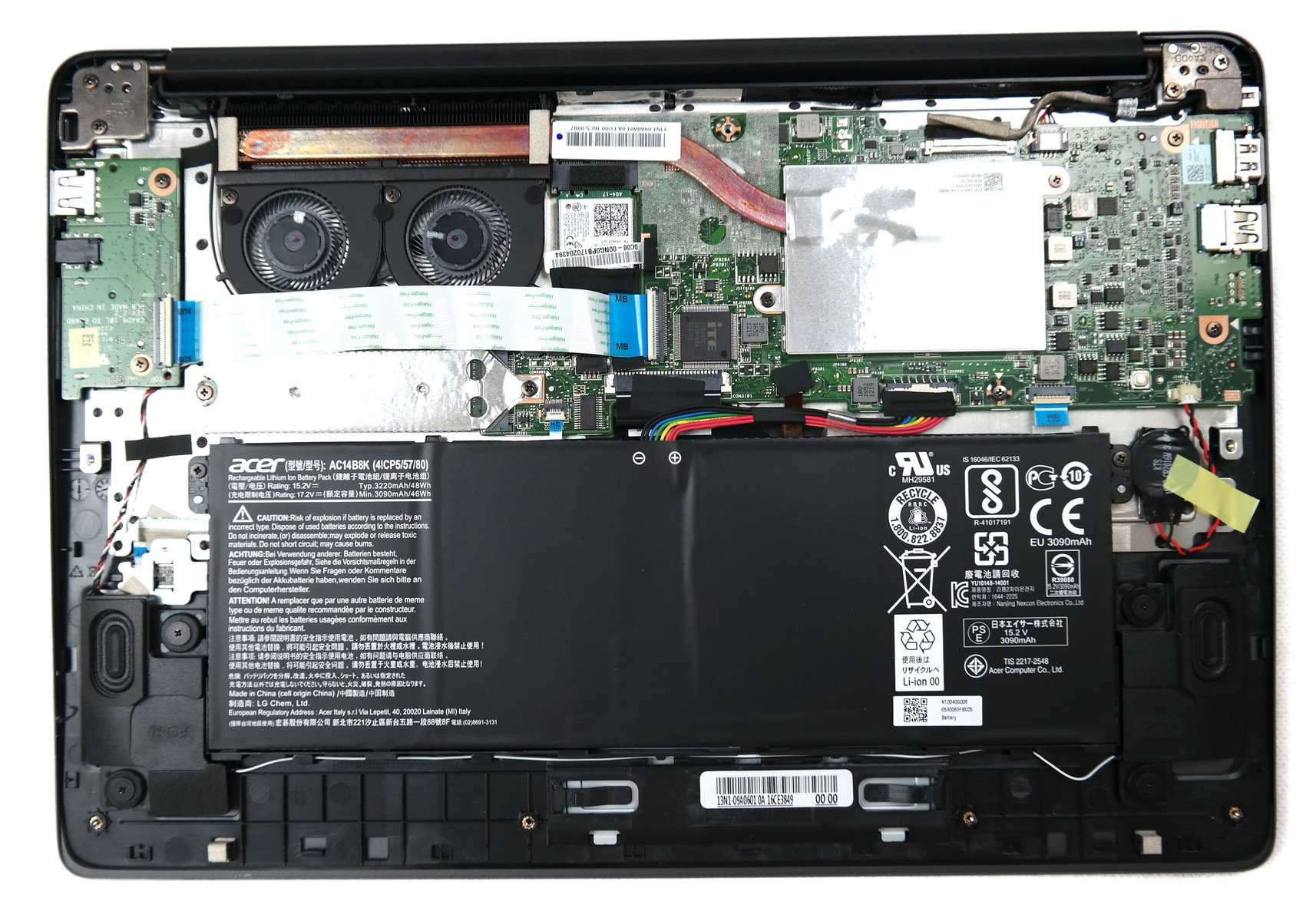 Eine Wartungsklappe ist am Acer Notebook nicht zu finden, jedoch lässt sich die gesamte Rückseite relativ einfach entfernen. Diese ist mit neun Schrauben und einer innen verklebten Plastikhalterung befestigt. Nach dem Entfernen der Standard-Kreuzschlitzschrauben kann sie mit Hilfe eines Fugenglätters, einer Kreditkarte oder eines Plektrums gelöst werden. Oberhalb des verklebten Akkus sind sowohl die Lüfter als auch die SSD leicht zugänglich. Das WLAN-Modul kann ebenfalls gewechselt werden, der RAM ist allerdings fest verlötet.
