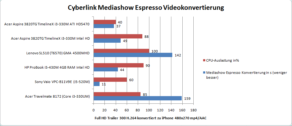 In unseren Praxistests haben wir wieder einige Audio- und Videodateien umwandeln lassen. Mit iTunes (1-Kern lastig) wurden unsere Testsongs in 13,6-facher Geschwindigkeit vom MP3 ins AAC Format gewandelt und mit Mediashow Espresso (Mehrkern) haben wir unsere Testdatei (Full HD Trailer 300) bei einer CPU Auslastung von 86% in 159s in ein iPhone kompatibles H.264 Format konvertiert. Das Thinkpad SL510 mit T6570 CPU hat für die Videoumwandlung zum Beispiel 142s benötigt. Damit kann die Core i3-330UM CPU insbesondere bei Mehrkernaufgaben die sehr geringe Taktfrequenz gut kaschieren. Die sonst üblichen Office-, Internet- und Kommunikationsprogramme laufen flüssig und lassen auch das Verwenden mehrerer Anwendungen gleichzeitig zu.