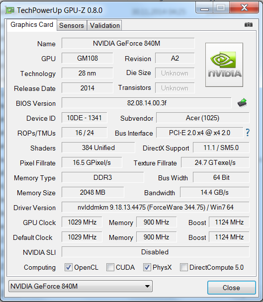 Der GeForce Kern gehört zur GPU-Mittelklasse. Er unterstützt DirectX 11 und arbeitet mit einer Basisgeschwindigkeit von 1.029 MHz. Per Turbo kann der Takt auf 1.124 MHz erhöht werden. Die Resultate in den 3D Mark Benchmark fallen so aus wie es die Hardware-Ausstattung erwarten lässt und liegen auf einer Höhe mit den Ergebnissen ähnlich ausgestatteter Notebooks wie beispielsweise dem Acer Aspire V 15 Nitro (VN7-571G-56NX).