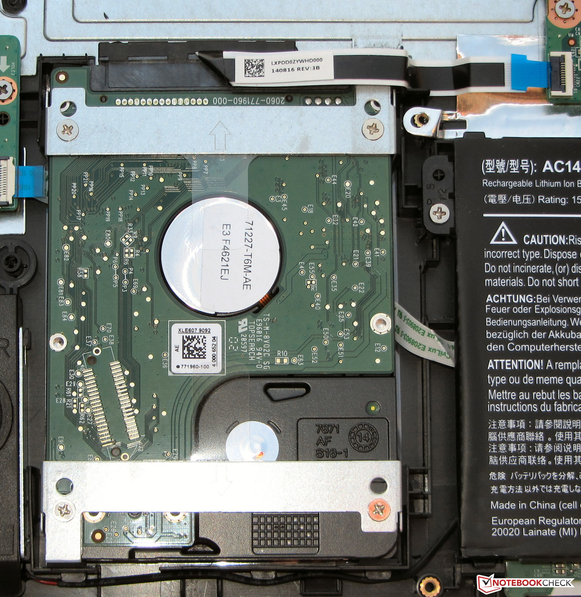 Wie bereits gesagt, verfügt das Travelmate nicht über eine Wartungsklappe. Um an die Hardware zu gelangen, müssen zuerst alle Schrauben auf der Unterseite des Rechners entfernt werden. Anschließend kann die Unterschale vorsichtig abgehebelt werden. Wir nutzen dafür einen Fugenglätter. Nach Entfernung der Unterschale hat man Zugriff auf den Arbeitsspeicher, die Festplatte, den Lüfter, das WLAN-Modul, die BIOS-Batterie und den Akku. Das Travelmate ist mit zwei Arbeitsspeicherbänken bestückt. Eine Bank ist mit einem 8-GB-Modul belegt. Ein Tausch der Festplatte ist schnell zu machen. Auch der Akku ließe sich im Falle eines Defekts wechseln.