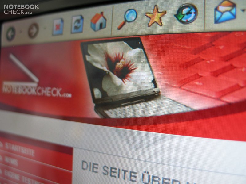 Das verbaute spiegelnde Breitbilddisplay mit einer Auflösung von 1280x800 Pixel bietet mit durchschnittlich 140 cd/m² eher durchschnittliche Helligkeitswerte die den Einsatz im Freien kaum ermöglichen (wegen den Spiegelungen). Hinzu kommt noch, dass das Alb die Helligkeit im Akkubetrieb auf maximal 118,8 cd/m² drosselt. Der erreichbare Konstrast ist mit 226:1 wegen der mittelmäßigen Helligkeit auch nicht berauschend. Die Ausleuchtung von knapp 80% ist mittelmäßig.