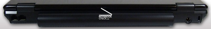 Rückseite: Modem, LAN, Akku, Netzanschluss, Kensington Lock